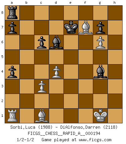 Last move : 1/2-1/2 2016 November 30 0:5:23 [Event "FICGS__CHESS__RAPID_A__000194"] [Site "FICGS"] [Date "2016.10.15"] [Round "1"] [White "Sorbi,Luca"] [Black "DiAlfonso,Darren"] [Result "1/2-1/2"] [WhiteElo "1988"] [BlackElo "2118"] 1.e4 e5 2.Nf3 Nf6 3.Nxe5 d6 4.Nf3 Nxe4 5.d4 d5 6.Bd3 Bd6 7.O-O O-O 8.c4 c6 9.Nc3 Nxc3 10.bxc3 dxc4 11.Bxc4 Bg4 12.Qd3 Nd7 13.Ng5 Nf6 14.h3 Bh5 15.f4 h6 16.g4 hxg5 17.fxg5 b5 18.Bb3 Nxg4 19.hxg4 Qd7 20.Qh3 Qxg4+ 21.Qxg4 Bxg4 22.Rxf7 Rxf7 23.g6 Kf8 24.Bxf7 Ke7 25.a4 bxa4 1/2-1/2 Petrov : Classical attack, Marshall variation Kingside Castling by player White (move 7) Kingside Castling by player Black (move 7) This chess game ended in a draw. Follow this game move after move (download)By this measure (on the gap between Fischer & his contemporaries), I consider him the greatest world champion. (Garry Kasparov) Pläne sind die Träume des Verständigen. (Ernst Freiherr von Feuchtersleben) Debemos de asegurarnos de que el Ajedrez no se convierta en un lenguaje muerto, muy interesante, pero solo para un grupo muy pequeño. (Sytze Faber) Le joueur d'Echecs qui veut atteindre le top est obligé de développer son propre credo créatif. Alexeï Stepanovicth Souétine. Il est facile d'écrire des livres ! Ce qui est difficile, c'est de jouer ! (Alexeï Stepanovicth Souétine) Who needs drugs and alcohol if he can play Big Chess at FICGS ? (Heinz-Georg Lehnhoff)