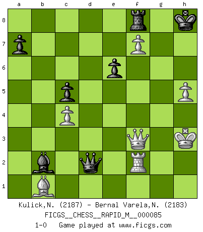 Last move : 1-0 2017 January 31 16:22:21 [Event "FICGS__CHESS__RAPID_M__000085"] [Site "FICGS"] [Date "2016.10.17"] [Round "1"] [White "Kulick,Neil"] [Black "Bernal Varela,Nelson"] [Result "1-0"] [WhiteElo "2187"] [BlackElo "2183"] 1.d4 Nf6 2.c4 e6 3.g3 Bb4+ 4.Bd2 Be7 5.Bg2 d5 6.Nf3 O-O 7.O-O c6 8.Qc2 b6 9.Rd1 Ba6 10.b3 Nbd7 11.a4 Re8 12.a5 Qc8 13.e3 dxc4 14.bxc4 c5 15.Rc1 h6 16.Qa4 Rd8 17.Nc3 Bf8 18.Nb5 Bb7 19.Qa2 Ne4 20.a6 Bc6 21.Rd1 Ng5 22.Nxg5 hxg5 23.e4 cxd4 24.Nxd4 Ba4 25.Qxa4 Nc5 26.Qc2 Rxd4 27.e5 Rb8 28.Bxg5 Rxd1+ 29.Qxd1 Qc7 30.h4 Be7 31.Bf4 Rd8 32.Qf3 Rd7 33.Qc6 Qb8 34.Kh2 Rc7 35.Qf3 Bf8 36.Qe2 Qd8 37.Bg5 Be7 38.Be3 Qc8 39.h5 Rd7 40.Rf1 Nxa6 41.Be4 Qc7 42.f4 Rd8 43.Bb1 Nb4 44.Bf2 Kf8 45.Kh3 Qd7 46.Bg1 Nd3 47.Qe4 f5 48.exf6 Bxf6 49.g4 Nc5 50.Qf3 Kg8 51.Bxc5 bxc5 52.g5 Bb2 53.f5 Kh8 54.f6 gxf6 55.gxf6 Qd2 56.f7 Rf8 57.Rf2 1-0 Catalan Opening Kingside Castling by player Black (move 6) Kingside Castling by player White (move 7) Player White won this chess game. Follow this game move after move (download)Some sacrifices are sound; the rest are mine. (Mikhail Tal) Je älter ich werde, um so mehr schätze ich die Bauern. (Paul Keres) Botvinnik trataba de restarle el misterio al Ajedrez, siempre relacionandolo a situaciones de la vida ordinaria. El gustaba de llamar al Ajedrez un típico problema inexacto similar a aquellos de los cuales la gente siempre tiene que enfrentarse en la vida cotidiana. (Garry Kasparov) Les ravages du H expliquent la différence de niveau entre Tal et Thal [Abergel]. The difference between perseverance and obstinacy is that one comes from a strong will, and the other from a strong won't. (Henry Ward Beecher)