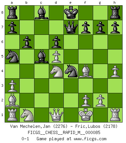 Last move : 0-1 2016 December 7 14:20:53 [Event "FICGS__CHESS__RAPID_M__000085"] [Site "FICGS"] [Date "2016.10.17"] [Round "1"] [White "Van Mechelen,Jan"] [Black "Fric,Lubos"] [Result "0-1"] [WhiteElo "2276"] [BlackElo "2178"] 1.e4 e5 2.Nf3 Nc6 3.Bc4 Bc5 4.b4 Bxb4 5.c3 Bc5 6.d4 exd4 7.cxd4 Bb4+ 8.Kf1 Nf6 9.a3 Be7 10.e5 Ne4 11.d5 Na5 12.Ba2 b6 13.h4 Bc5 14.Nd4 Qe7 15.Bf4 d6 16.exd6 cxd6 0-1 Evans gambit Player Black won this chess game. Follow this game move after move (download)Chess books should be used as we use glasses: to assist the sight, although some players make use of them as if they thought they conferred sight. (Jose Raul Capablanca) Schach ist Leben. (Robert James Fischer) La única cosa que los jugadores de Ajedrez tienen en común, es el Ajedrez. (Lodewijk Prins) 'L'échange des dames est un coup dur pour les deux adversaires...' Un journaliste lors d'une partie du match Spassky-Fischer Indecision is the key to flexibility. (Unknown)
