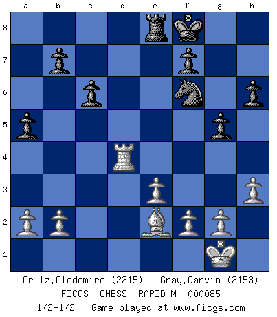 Last move : 1/2-1/2 2016 December 3 15:56:41 [Event "FICGS__CHESS__RAPID_M__000085"] [Site "FICGS"] [Date "2016.10.17"] [Round "1"] [White "Ortiz,Clodomiro"] [Black "Gray,Garvin"] [Result "1/2-1/2"] [WhiteElo "2215"] [BlackElo "2153"] 1.d4 Nf6 2.c4 e6 3.Nf3 Be7 4.Nc3 d5 5.Bg5 O-O 6.e3 h6 7.Bxf6 Bxf6 8.Rc1 c6 9.Bd3 dxc4 10.Bxc4 Nd7 11.O-O e5 12.Ne4 exd4 13.Nxf6+ Nxf6 14.Qxd4 Bg4 15.Qf4 Re8 16.Rfd1 Qe7 17.h3 Bxf3 18.Qxf3 Rad8 19.Qf4 Kf8 20.Be2 Ne4 21.Rxd8 Qxd8 22.Rc4 g5 23.Qf5 Qf6 24.Qxf6 Nxf6 25.Rd4 a5 1/2-1/2 Queen's pawn game Kingside Castling by player Black (move 5) Kingside Castling by player White (move 11) This chess game ended in a draw. Follow this game move after move (download)The mistakes are there, waiting to be made. (Savielly Tartakower) Der beste Spieler in einem Turnier gewinnt es nie. Er landet auf Platz zwei oder drei. (Siegbert Tarrasch) El Ajedrez, como cualquier actividad creativa, solo puede existir a través del esfuerzo combinado de aquellos que tienen talento creativo y de aquellos que poseen la habilidad de organizar su trabajo creativo. (Mikhail Botvinnik) Les échecs, c'est l'art d'analyser. (Mikhail Botvinnik) The difference between stupidity and genius is that genius has its limits. (Murphy)