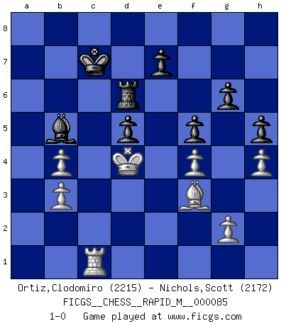 Last move : 1-0 2016 October 24 17:13:12 [Event "FICGS__CHESS__RAPID_M__000085"] [Site "FICGS"] [Date "2016.10.17"] [Round "1"] [White "Ortiz,Clodomiro"] [Black "Nichols,Scott"] [Result "1-0"] [WhiteElo "2215"] [BlackElo "2172"] 1.d4 f5 2.Bg5 g6 3.Nc3 Bg7 4.Nf3 Nc6 5.d5 Ne5 6.Nxe5 Bxe5 7.Qd2 Nf6 8.f4 Bxc3 9.Qxc3 O-O 10.Bxf6 Rxf6 11.e3 d6 12.O-O-O Bd7 13.h3 a5 14.Be2 c6 15.Qb3 a4 16.Qxb7 Rb8 17.Qa6 cxd5 18.Rxd5 Re6 19.Bf3 Rxe3 20.Qa7 Rb6 21.R5d1 Kf8 22.h4 h5 23.a3 Ke8 24.Rd4 Qb8 25.Qxb8+ Rxb8 26.Kd2 Re6 27.Rb1 Kd8 28.Rc4 Rf6 29.Rb4 Rxb4 30.axb4 Bb5 31.Rc1 d5 32.Ke3 Rd6 33.Kd4 Kc7 34.b3 axb3 35.cxb3 1-0 Dutch, 2.Bg5 variation Kingside Castling by player Black (move 9) Queenside Castling by player White (move 12) Player White won this chess game. Follow this game move after move (download)Bobby Fischer is the greatest Chess genius of all time ! (Alexander Kotov) Moralische Siege zählen nicht. (Savielly Grigorievitsch Tartakower) ¿Cual es el objetivo de jugar una apertura de gambito?... Para adquirir una reputación de ser un jugador apuesto a costo de perder el juego. (Siegbert Tarrasch) Ce n'est pas pour s'amuser qu'il joue aux échecs : il célèbre un culte. (Vladimir Nabokov) Those who make the worst use of their time are the first to complain of its brevity. (Jean de la Bruyere)