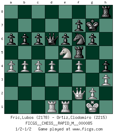 Last move : 1/2-1/2 2016 December 27 15:10:16 [Event "FICGS__CHESS__RAPID_M__000085"] [Site "FICGS"] [Date "2016.10.17"] [Round "1"] [White "Fric,Lubos"] [Black "Ortiz,Clodomiro"] [Result "1/2-1/2"] [WhiteElo "2178"] [BlackElo "2215"] 1.e4 g6 2.d4 Bg7 3.Nc3 d6 4.Nf3 Nf6 5.Be2 O-O 6.O-O e6 7.Be3 b6 8.Qd2 Bb7 9.Bg5 Qd7 10.e5 dxe5 11.Nxe5 Qc8 12.Rad1 Nbd7 13.Bh6 Qd8 14.Bxg7 Kxg7 15.f4 Qe7 16.Bf3 Bxf3 17.Rxf3 a6 18.a4 h5 19.h3 Rh8 20.Qe2 Qd6 21.Rf2 h4 22.Qf3 Rhd8 23.Re2 Rac8 24.Qf2 Rh8 25.R2e1 Rh5 26.Qe2 Ra8 27.b3 c6 28.Ne4 Nxe4 29.Qxe4 Nf6 30.Qf3 Rf5 31.c4 Rd8 32.b4 Rc8 33.Qf2 Rh8 1/2-1/2 Robatsch defense : Two knights variation Kingside Castling by player Black (move 5) Kingside Castling by player White (move 6) This chess game ended in a draw. Follow this game move after move (download)I know people who have all the will in the world, but still can't play good Chess. (Bobby Fischer) Ich war zu klein für die Schach-Schülermannschaft! (Woody Allen) Debemos de asegurarnos de que el Ajedrez no se convierta en un lenguaje muerto, muy interesante, pero solo para un grupo muy pequeño. (Sytze Faber) Votre prénom est 'Tactique', votre deuxième prénom est 'Tactique' et votre nom est 'Tactique'. (Ken Smith) You can think I'm wrong, but that's no reason to quit thinking. (Gregory House, House M.D.)
