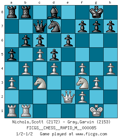 Last move : 1/2-1/2 2016 November 24 21:36:25 [Event "FICGS__CHESS__RAPID_M__000085"] [Site "FICGS"] [Date "2016.10.17"] [Round "1"] [White "Nichols,Scott"] [Black "Gray,Garvin"] [Result "1/2-1/2"] [WhiteElo "2172"] [BlackElo "2153"] 1.d4 d5 2.c4 e6 3.Nf3 Nf6 4.Nc3 Be7 5.Bf4 O-O 6.e3 Nbd7 7.c5 Nh5 8.Bd3 b6 9.b4 Nxf4 10.exf4 a5 11.a3 c6 12.O-O Qc7 13.g3 Ba6 14.Bxa6 Rxa6 15.Qe2 R6a8 16.h4 Bf6 17.Ne5 Rfb8 18.Rfb1 Bd8 19.Nf3 1/2-1/2 Queen's gambit declined Kingside Castling by player Black (move 5) Kingside Castling by player White (move 12) This chess game ended in a draw. Follow this game move after move (download)The battle for the ultimate truth will never be won. And that's why Chess is so fascinating. (Hans Kmoch) Um dein Spiel zu verbessern musst du zuallererst das Endspiel studieren, denn diese kann unabhängig studiert werden. Die Eröffnung und das Mittelspiel müssen immer in Bezug gesetzt werden zum Endspiel. (José Raúl Capablanca) No todos los artistas son jugadores de Ajedrez, pero todos los jugadores de Ajedrez son artistas. (Marcel Duchamp) Karpov est une pièce de musée. (Garry Kasparov) Now be brave and don't look back. Don't look back. (Shmi Skywalker in Star Wars ep.1)