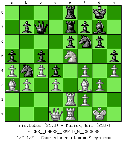 Last move : 1/2-1/2 2016 December 24 23:27:59 [Event "FICGS__CHESS__RAPID_M__000085"] [Site "FICGS"] [Date "2016.10.17"] [Round "1"] [White "Fric,Lubos"] [Black "Kulick,Neil"] [Result "1/2-1/2"] [WhiteElo "2178"] [BlackElo "2187"] 1.Nf3 d5 2.g3 Nf6 3.Bg2 c6 4.O-O Bg4 5.h3 Bxf3 6.exf3 e6 7.d3 Bd6 8.Nd2 O-O 9.f4 a5 10.a4 Qc7 11.Nf3 c5 12.b3 Nc6 13.Bb2 Rad8 14.Rc1 Rfe8 15.c3 Bf8 16.Re1 Qb6 17.Re2 Nd7 18.h4 g6 19.Qc2 Bg7 20.Rce1 d4 21.c4 Nb4 22.Qd2 Re7 23.Ba3 Rde8 24.Bh3 Nc6 25.Qd1 Nf6 26.Ne5 Nb4 27.Bg2 h5 28.Bf3 Qc7 1/2-1/2 Reti : King's Indian attack, Yugoslav variation Kingside Castling by player White (move 4) Kingside Castling by player Black (move 8) This chess game ended in a draw. Follow this game move after move (download)A win by an unsound combination, however showy, fills me with artistic horror. (Wilhelm Steinitz) Modernes Schach sorgt sich zuviel um Dinge wie Bauernstruktur usw. Vergessen Sie das, Schachmatt beendet das Spiel! (Nigel Short) Al jugar al Ajedrez entonces, podemos aprender: Primero: Previsión... Segundo: Prudencia... Tercero: Cautela... Y al final, aprendemos del Ajedrez el hábito de no ser desanimados por apariencias malas presentes en el estado de nuestros asuntos, el hábito de la esperanza por una oportunidad favorable y la perseveración de los secretos de los recursos. (Benjamin Franklin) A ce moment-là, je menaçais de comprendre la position ! (Clément L'Heureux) Dave, my mind is going. I can feel it. (HAL 9000 in 2001, a space odyssey)