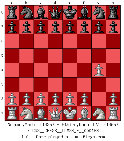 Last move : 1-0 2016 November 27 18:45:41 [Event "FICGS__CHESS__CLASS_F__000183"] [Site "FICGS"] [Date "2016.10.18"] [Round "1"] [White "Nezumi,Mashi"] [Black "Ethier,Donald V."] [Result "1-0"] [WhiteElo "1335"] [BlackElo "1365"] 1.g4 1-0 This chess game has been lost on time (started : 2016.10.18 16:45:29) Grob's attack Player White won this chess game. Follow this game move after move (download)Chess is mental torture. (Garry Kasparov) Spielt Blackmar-Diemer-Gambit, und das Matt kommt von selbst! (Emil Joseph Diemer) No solamente yo pronostico su triunfo sobre Botvinnik, sino que me adelanto y digo que probablemente Fischer es el jugador de Ajedrez mas grande que haya existido. (John Collins) Demandez au pauvre Cg1 ce qu'il en pense. Eduard Gufeld à propos de la variante Saemisch de l'Est-Indienne. A shortcut is the longest distance between two points. (Don Groves)