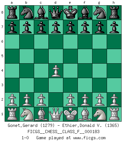 Last move : 1-0 2016 November 27 18:45:41 [Event "FICGS__CHESS__CLASS_F__000183"] [Site "FICGS"] [Date "2016.10.18"] [Round "1"] [White "Gonet,Gerard"] [Black "Ethier,Donald V."] [Result "1-0"] [WhiteElo "1279"] [BlackElo "1365"] 1.d4 1-0 This chess game has been lost on time (started : 2016.10.18 16:45:29) Queen's pawn Player White won this chess game. Follow this game move after move (download)Fischer wanted to give the Russians a taste of their own medicine. (Larry Evans) Ich verachte die Medien. (Robert James Fischer) Existen dos clases de sacrificios: los correctos y los míos. (Mikhail Tal) Toutes les manuvres exécutées sur une colonne ouverte ont pour but ultime l'intrusion définitive sur la septième ou la huitième rangée, en plein cur de la position ennemie. (Aaron Nimzovitch) The large trees attract high winds. (Chinese proverb)