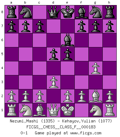 Last move : 0-1 2016 December 17 8:52:49 [Event "FICGS__CHESS__CLASS_F__000183"] [Site "FICGS"] [Date "2016.10.18"] [Round "1"] [White "Nezumi,Mashi"] [Black "Kehayov,Yulian"] [Result "0-1"] [WhiteElo "1335"] [BlackElo "1077"] 1.g4 e5 2.d3 d5 3.Bg2 Be6 0-1 This chess game has been lost on time (started : 2016.10.18 16:45:29) Grob's attack Player Black won this chess game. Follow this game move after move (download)Up to this point White has been following well-known analysis. But now he makes a fatal error: he begins to use his own head. (Siegbert Tarrasch) Wir irren allesamt, nur jeder irrt anders. (Georg Christoph Lichtenberg) Prefiero perder una partida realmente buena, que ganar una mala. (David Levy) Votre prénom est 'Tactique', votre deuxième prénom est 'Tactique' et votre nom est 'Tactique'. (Ken Smith) I find your interest interesting. (Gregory House, House M.D.)
