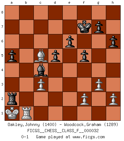 Last move : 0-1 2007 May 4 14:48:38 [Event "FICGS__CHESS__CLASS_F__000032"] [Site "FICGS"] [Date "2007.03.29"] [Round "1"] [White "Oakley,Johnny"] [Black "Woodcock,Graham"] [Result "0-1"] [WhiteElo "1400"] [BlackElo "1289"] 1.e4 e6 2.d4 Nf6 3.Bg5 Be7 4.Nc3 h6 5.Bh4 Nxe4 6.Bxe7 Nxc3 7.Bxd8 Nxd1 8.Bxc7 Nxb2 9.Bd6 Na4 10.Rb1 Nc6 11.Bd3 a5 12.Ne2 b6 13.Bb5 Nxd4 14.Bxa4 Nxe2 15.Kxe2 Ba6+ 16.Ke3 Bc4 17.Rxb6 Bxa2 18.Kd4 Rc8 19.Rb8 Rxb8 20.Bxb8 O-O 21.Bd6 Rc8 22.c3 Rc4+ 23.Ke3 Rxa4 24.Rd1 Bd5 25.g3 Re4+ 26.Kd2 Bc4 27.Bc5 Re2+ 28.Kc1 d5 29.Kb1 f5 30.Ka1 Kf7 31.Rb1 Ra2+ 0-1 French defense Kingside Castling by player Black (move 20) Player Black won this chess game. Follow this game move after move (download)If your opponent offers you a draw, try to work out why he thinks he's worse off. (Nigel Short) Es tut gut, die Entwicklungsperiode von, [...] demokratischem Geist durchdringen zu lassen. Wie undemokratisch wäre es doch beispielsweise, den einen Offizier große Spaziertouren vornehmen zu lassen, während die anderen zu Hause säßen und sich entsetzlich langweilten. (Aaron Nimzowitsch) Dejen al perfeccionista jugar por correo. (Yasser Seirawan) Nous sommes les pions de la mystérieuse partie d'Echecs jouée par Dieu. Il nous déplace, nous arrête, nous pousse encore, puis nous lance un à un dans la boîte du Néant. Epitaphe sur la tombe de David Janowsky (1868-1927). Internal peace cannot coexist with external war. (Don Groves)