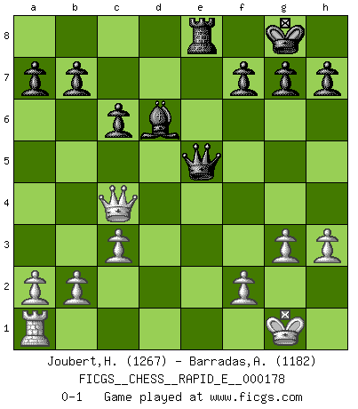 Last move : 0-1 2016 November 7 7:39:3 [Event "FICGS__CHESS__RAPID_E__000178"] [Site "FICGS"] [Date "2016.10.26"] [Round "1"] [White "Joubert,Hennie"] [Black "Barradas,Anderson"] [Result "0-1"] [WhiteElo "1267"] [BlackElo "1182"] 1.e4 e5 2.Nf3 Nc6 3.Bc4 Bc5 4.d4 Nxd4 5.Nxe5 Ne6 6.O-O Nf6 7.Nc3 O-O 8.Bg5 Nxg5 9.Bd3 d6 10.Nf3 Bg4 11.Be2 Ngxe4 12.Nxe4 Nxe4 13.h3 Bxf3 14.Bxf3 d5 15.Qd3 c6 16.Bxe4 dxe4 17.Qxe4 Qf6 18.c3 Rfe8 19.Qc4 Bd6 20.Rfe1 Re5 21.g3 Rae8 22.Rxe5 Qxe5 0-1 Giuoco Piano Kingside Castling by player White (move 6) Kingside Castling by player Black (move 7) Player Black won this chess game. Follow this game move after move (download)The tactician knows what to do when there is something to do; whereas the strategian knows what to do when there is nothing to do. (Gerald Abrahams) Es ist im Leben wie im Schachspiel. Wir entwerfen einen Plan, dieser bleibt jedoch bedingt durch das, was im Schachspiel dem Gegner, im Leben dem Schicksal zu tun belieben wird. (Arthur Schopenhauer) Me dio la sensación de como si yo estuviera jugando en contra del mismo Ajedrez. - al estar jugando en contra de Robert Fischer (Walter Shipman) Lorsque vous vous retrouvez devant une position atroce, ne tendez pas un ultime piège dérisoire avec l'intention d'abandonner si l'adversaire le déjoue ! Faites-vous plutôt un devoir de résister comme si votre vie en dépendait. Jouez le coup qui vous déplairait au centuple si vous étiez dans la peau de votre tortionnaire ! I've never seen so many men wasted so badly. (Blondie in The Good, The Bad and The Ugly)