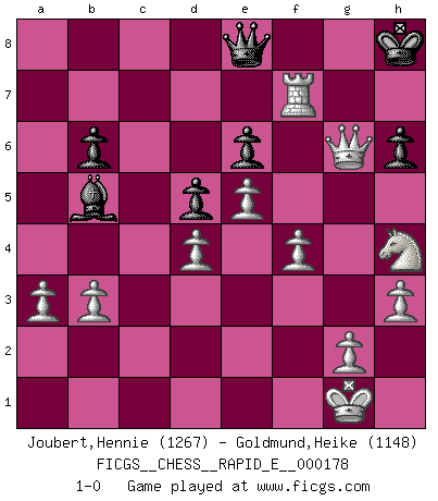 Last move : 1-0 2016 December 2 18:2:55 [Event "FICGS__CHESS__RAPID_E__000178"] [Site "FICGS"] [Date "2016.10.26"] [Round "1"] [White "Joubert,Hennie"] [Black "Goldmund,Heike"] [Result "1-0"] [WhiteElo "1267"] [BlackElo "1148"] 1.e4 d5 2.e5 Bf5 3.d4 e6 4.Nd2 c5 5.c3 Nc6 6.Bb5 Qb6 7.Bxc6+ Qxc6 8.Ne2 Bg6 9.Nf3 Ne7 10.Be3 Nf5 11.Qd2 Nxe3 12.Qxe3 Be7 13.O-O O-O 14.Rac1 b6 15.Nf4 Be4 16.a3 cxd4 17.cxd4 Qb7 18.Nd2 Bf5 19.Rc3 Rac8 20.Rfc1 Bg5 21.h3 h6 22.Nf3 Bxf4 23.Qxf4 Rxc3 24.Rxc3 Rc8 25.Nh4 Be4 26.Rg3 Kh7 27.f3 Bd3 28.Qd2 Bb5 29.f4 Qc7 30.Rc3 Qd7 31.Qc2+ g6 32.Rxc8 Ba6 33.Rc7 Qe8 34.Rxa7 Bc4 35.b3 Bb5 36.Qxg6+ Kh8 37.Rxf7 1-0 Scandinavian (centre counter) defense Kingside Castling by player White (move 13) Kingside Castling by player Black (move 13) Player White won this chess game. Follow this game move after move (download)Chess is life. (Bobby Fischer) Wenn Schach ein enormer Dschungel ist, der seine Myriaden von Geheimnissen nicht preisgeben will, dann sind Computer die Kettensägen einer gewaltigen ökologisch unsensiblen Nutzholzfirma. (Nigel Short) ¿Que sería del Ajedrez sin errores graciosos?. (Kurt Richter) Fischer est le meilleur joueur du monde et Karpov n'est qu'un joueur de bistrot. (Garry Kasparov, agé de 16 ans) You lose, general Kenobi. (General Grievous in Star Wars ep.3)