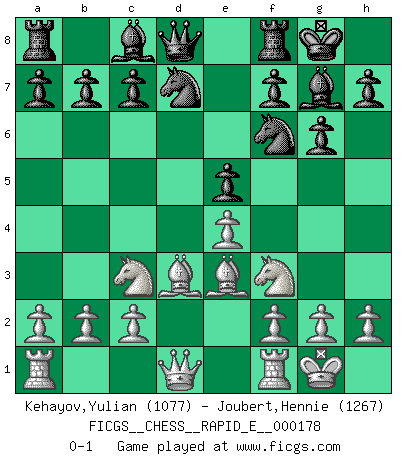 Last move : 0-1 2016 December 18 20:56:31 [Event "FICGS__CHESS__RAPID_E__000178"] [Site "FICGS"] [Date "2016.10.26"] [Round "1"] [White "Kehayov,Yulian"] [Black "Joubert,Hennie"] [Result "0-1"] [WhiteElo "1077"] [BlackElo "1267"] 1.d4 Nf6 2.Nc3 g6 3.e4 d6 4.Nf3 Bg7 5.Bd3 O-O 6.O-O Nbd7 7.Be3 e5 8.dxe5 dxe5 0-1 This chess game has been lost on time (started : 2016.10.26 13:39:18) Queen's pawn game Kingside Castling by player Black (move 5) Kingside Castling by player White (move 6) Player Black won this chess game. Follow this game move after move (download)Chess is a terrible game. If you have no center, your opponent has a freer position. If you do have a center, then you really have something to worry about ! (Siegbert Tarrasch) Die unerbitterlichsten Regeln im Schach sind die Ausnahmen. (Savielly Grigorievitsch Tartakower) No hay un Gran Maestro de Ajedrez que sea normal; solo se diferencían ellos por la magnitud de su locura. (Viktor Korchnoi) Le jeu d'échecs est comme rejeté hors du temps. (Antoine de Saint-Exupéry) When you've done things right people won't know you've done anything at all. (Futurama)