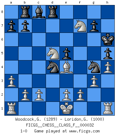 Last move : 1-0 2007 April 4 15:53:29 [Event "FICGS__CHESS__CLASS_F__000032"] [Site "FICGS"] [Date "2007.03.29"] [Round "1"] [White "Woodcock,Graham"] [Black "Loridon,Geoffroy"] [Result "1-0"] [WhiteElo "1289"] [BlackElo "1000"] 1.Nf3 d5 2.d4 Nf6 3.g3 Nc6 4.Bg2 e6 5.a3 h5 6.Bg5 Be7 7.Nc3 Ng4 8.Bxe7 Qxe7 9.Qd3 f6 10.Nb5 e5 11.Qg6+ Qf7 12.Qxf7+ Kxf7 13.Nxc7 Rb8 14.dxe5 fxe5 15.Nxd5 Rd8 16.Ng5+ Kg6 17.h4 Nd4 18.Be4+ Kh6 19.Nf7+ 1-0 Reti Opening Player White won this chess game. Follow this game move after move (download)The only thing Chess players have in common is Chess. (Lodewijk Prins) Garry Kasparov war erst in der Großmeister-Organisation GMA, dann in der Profischach-Vereinigung PCA, zum Schluss kehrte er wieder in den Schoß der FIDE zurück. Aber gut, manche Leute sind flexibel (Viswanathan Anand) El Ajedrez es un terrible juego. Si no controlas el centro, tu oponente tiene una posición mas holgada. Si tienes control del centro, ¡entonces realmente tu tienes algo de que preocuparte!. (Siegbert Tarrasch) Les Echecs ne sont pas pour les âmes timides. Ils requièrent un homme entier, qui ne s'arrête pas aveuglément à ce qui a été déjà établi, mais qui tente individuellement de sonder les profondeurs du jeu. (W. Steinitz) At work, the authority of a person is inversely proportional to the number of pens that person is carrying. (Dan Rotaru)