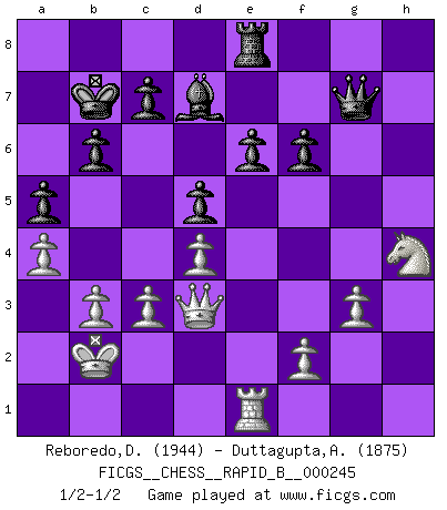 Last move : 1/2-1/2 2017 January 29 8:24:17 [Event "FICGS__CHESS__RAPID_B__000245"] [Site "FICGS"] [Date "2016.10.28"] [Round "1"] [White "Reboredo,Daniel"] [Black "Duttagupta,Aniruddha"] [Result "1/2-1/2"] [WhiteElo "1944"] [BlackElo "1875"] 1.e4 e6 2.d4 d5 3.Nc3 Nf6 4.Bg5 Bb4 5.e5 h6 6.exf6 hxg5 7.fxg7 Rg8 8.h4 gxh4 9.Nf3 Qf6 10.Rxh4 Qxg7 11.Qd3 Nc6 12.O-O-O a6 13.Rh7 Qf6 14.Qe3 Bxc3 15.Qxc3 Bd7 16.Qe3 O-O-O 17.c3 Rh8 18.Rxh8 Qxh8 19.Bd3 f6 20.Bc2 Qg8 21.g3 Re8 22.Ba4 Qg4 23.Re1 Kb8 24.a3 Qg7 25.Bxc6 Bxc6 26.b3 Bd7 27.Kb2 a5 28.a4 b6 29.Qd3 Kb7 30.Nh4 1/2-1/2 French : MacCutcheon, Chigorin variation Queenside Castling by player White (move 12) Queenside Castling by player Black (move 16) This chess game ended in a draw. Follow this game move after move (download)Chess demands total concentration. (Bobby Fischer) Als ich elf wurde, wurde ich einfach gut. (Robert James Fischer) ¿Esta Bobby Fischer algo cuerdo?. (Salo Flohr) Karpov est une pièce de musée. (Garry Kasparov) You can only get smarter by playing a smarter opponent. (Revolver, movie)