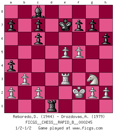 Last move : 1/2-1/2 2017 January 8 16:25:0 [Event "FICGS__CHESS__RAPID_B__000245"] [Site "FICGS"] [Date "2016.10.28"] [Round "1"] [White "Reboredo,Daniel"] [Black "Drozdovas,Arturas"] [Result "1/2-1/2"] [WhiteElo "1944"] [BlackElo "1979"] 1.e4 e5 2.Nf3 Nc6 3.Bb5 Nf6 4.O-O Nxe4 5.d4 Nd6 6.Bxc6 dxc6 7.dxe5 Nf5 8.Qxd8+ Kxd8 9.Rd1+ Ke8 10.Nc3 Be7 11.Bg5 Bxg5 12.Nxg5 h6 13.Nge4 b6 14.f4 Ne3 15.Rd2 Nc4 16.Rd4 Ba6 17.b3 Ne3 18.Rc1 Ke7 19.Ng3 Rhd8 20.Re4 Nd5 21.Nxd5+ Rxd5 22.f5 Rad8 23.Ra4 Ra5 24.Rxa5 bxa5 25.Re1 Bc8 26.Re3 Rd1+ 27.Kf2 a4 1/2-1/2 Ruy Lopez : Berlin defense, Open variation Kingside Castling by player White (move 4) This chess game ended in a draw. Follow this game move after move (download)Modern Chess is too much concerned with things like Pawn structure. Forget it, Checkmate ends the game. (Nigel Short) Schachspieler können ausgezeichnet Varianten am Schachbrett berechnen, aber nicht im realen Leben. Zu stark ist der Individualismus im Schach ausgeprägt, und für viele ist ein kleiner momentaner persönlicher Vorteil wichtiger als ein weit größerer Vorteil von morgen. (Anatoly Karpov) Los Peones son nacidos libres, y aún así, se encuentran encadenados por todos lados. (Rick Kennedy) Les Echecs représentent une sphère d'idées créatrices basée sur la volonté des deux protagonistes. (Smyslov) It is not true that people stop pursuing dreams because they grow old, they grow old because they stop pursuing dreams. (Gabriel Garcia Marquez)