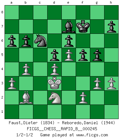 Last move : 1/2-1/2 2017 February 22 17:46:17 [Event "FICGS__CHESS__RAPID_B__000245"] [Site "FICGS"] [Date "2016.10.28"] [Round "1"] [White "Faust,Dieter"] [Black "Reboredo,Daniel"] [Result "1/2-1/2"] [WhiteElo "1834"] [BlackElo "1944"] 1.e4 e6 2.d4 d5 3.e5 c5 4.c3 Nc6 5.Be2 Qb6 6.Nf3 cxd4 7.cxd4 Nh6 8.Bd3 Bd7 9.Bc2 Nf5 10.Bxf5 exf5 11.a3 Rc8 12.O-O Be7 13.Nc3 Be6 14.Na4 Qd8 15.b4 O-O 16.Nc5 b6 17.Nxe6 fxe6 18.Qd3 Qd7 19.Bd2 Rc7 20.Rfc1 Rfc8 21.h3 Nd8 22.Rxc7 Rxc7 23.Rc1 Rxc1+ 24.Bxc1 Qc6 25.Bb2 a6 26.Kf1 Qc4 27.Ke2 Kf7 28.Nd2 Qxd3+ 29.Kxd3 Nc6 30.g3 g5 1/2-1/2 French : Advance variation Kingside Castling by player White (move 12) Kingside Castling by player Black (move 15) This chess game ended in a draw. Follow this game move after move (download)Many have become Chess Masters, no one has become the Master of Chess. (Siegbert Tarrasch) Rubinstein ist ein Turmendspiel, welches die Götter vor tausenden von Jahren begannen. (Savielly Grigorievitsch Tartakower) El Ajedrez es 99 por ciento táctica. (Teichmann) Botvinnik disait en comparant les échecs à la musique: Il existe une science dont le but est l'étude de l'acoustique et des sons. Mais il y a aussi un art qui se sert de l'océan des sons : c'est la musique. De toute évidence, il en est de même pour la pensée. La logique est l'étude des lois de la réflexion et les échecs reflètent, en tant qu'art, le côté logique de la réflexion, sous la forme d'images artistiques... Extrait de Fischer - Spassky, Reykjavik 1972 par Alexander & F. Wyndham (Ed. Solar), p 37. All maxims have their antagonist maxims; proverbs should be sold in pairs, a single one being but a half truth. (William Mathews)