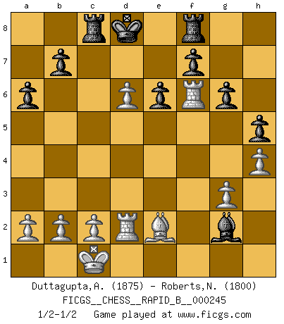 Last move : 1/2-1/2 2017 February 5 0:31:21 [Event "FICGS__CHESS__RAPID_B__000245"] [Site "FICGS"] [Date "2016.10.28"] [Round "1"] [White "Duttagupta,Aniruddha"] [Black "Roberts,Neil"] [Result "1/2-1/2"] [WhiteElo "1875"] [BlackElo "1800"] 1.e4 e6 2.d4 d5 3.Nc3 Nf6 4.Bg5 Be7 5.e5 Nfd7 6.h4 h6 7.Be3 c5 8.Qg4 g6 9.dxc5 Nxe5 10.Qg3 Nbc6 11.O-O-O h5 12.Nb5 a6 13.Nd6+ Bxd6 14.cxd6 Ng4 15.Nh3 Nxe3 16.fxe3 Qf6 17.e4 dxe4 18.Ng5 Qe5 19.Qxe5 Nxe5 20.Nxe4 Bd7 21.Nf6+ Kd8 22.Be2 Bc6 23.Rhg1 Rc8 24.g3 Nd7 25.Rgf1 Bg2 26.Rf4 Nxf6 27.Rxf6 Rf8 28.Rd2 1/2-1/2 French : Albin-Alekhine-Chatard attack Queenside Castling by player White (move 11) This chess game ended in a draw. Follow this game move after move (download)Live, lose, and learn, by observing your opponent how to win. (Amber Steenbock) Schach ist mein Leben, meine Leidenschaft, was ich gelernt habe und seit meinem 14. Lebensjahr profimässig praktiziere. Darauf zu verzichten, würde mir sehr schwer fallen. (Viktor Kortschnoi) El juego de Damas es para vagabundos. (Paul Morphy) Je crois qu'il existe des manières très spécifiques de jouer efficacement contre une machine. Evidemment, nous n'avons aucune chance en technique pure, parce que l'ordinateur calcule de manière parfaite. Mais lorsque nous faisons appel à notre cerveau, en utilisant l'intuition et la compréhension, alors nous restons beaucoup plus forts. (Anatoli Karpov) Pushing plastic is for the many, pushing virtual pieces is for the fewer, pushing wood is for the very few. (Normajean Yates)