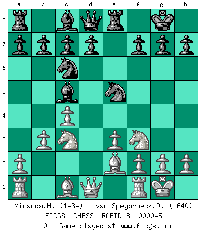 Last move : 1-0 2007 April 13 11:13:30 [Event "FICGS__CHESS__RAPID_B__000045"] [Site "FICGS"] [Date "2007.03.29"] [Round "1"] [White "Miranda,Marcus"] [Black "van Speybroeck,Dirk-Jan"] [Result "1-0"] [WhiteElo "1434"] [BlackElo "1640"] 1.d4 Nf6 2.c4 e5 3.dxe5 Ng4 4.Nf3 Bc5 5.e3 Nc6 6.Be2 O-O 7.O-O Re8 8.Nc3 Ngxe5 9.b3 1-0 Budapest : Adler variation Kingside Castling by player Black (move 6) Kingside Castling by player White (move 7) Player White won this chess game. Follow this game move after move (download)Bobby Fischer's current state of mind is indeed a tragedy. One of the world's greatest Chess players - the pride and sorrow of American Chess. (Frank Brady) Wenn Schach ein enormer Dschungel ist, der seine Myriaden von Geheimnissen nicht preisgeben will, dann sind Computer die Kettensägen einer gewaltigen ökologisch unsensiblen Nutzholzfirma. (Nigel Short) Si yo gano un torneo, yo lo gano por mí mismo. Yo hago las jugadas. Nadie me ayuda. (Bobby Fischer) Fischer est le meilleur joueur du monde et Karpov n'est qu'un joueur de bistrot. (Garry Kasparov, agé de 16 ans) You lose, general Kenobi. (General Grievous in Star Wars ep.3)