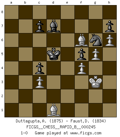 Last move : 1-0 2017 May 27 18:58:32 [Event "FICGS__CHESS__RAPID_B__000245"] [Site "FICGS"] [Date "2016.10.28"] [Round "1"] [White "Duttagupta,Aniruddha"] [Black "Faust,Dieter"] [Result "1-0"] [WhiteElo "1875"] [BlackElo "1834"] 1.e4 e5 2.Nf3 Nc6 3.d4 exd4 4.Nxd4 Bb4+ 5.c3 Be7 6.Nxc6 dxc6 7.Qxd8+ Kxd8 8.Be3 Nf6 9.f3 a5 10.Nd2 a4 11.Bc4 b5 12.Be2 Be6 13.a3 Kc8 14.c4 b4 15.axb4 Bxb4 16.Kf2 Kb7 17.Nb1 Nd7 18.Nc3 Bxc3 19.bxc3 c5 20.Rhb1+ Kc6 21.Rb5 Rhb8 22.Rxb8 Nxb8 23.f4 a3 24.e5 Ra5 25.Ra2 f6 26.exf6 gxf6 27.Bc1 Nd7 28.Bf3+ Kd6 29.g4 Bxc4 30.Rxa3 Rxa3 31.Bxa3 f5 32.g5 Bd5 33.Bd1 Nb6 34.h4 Nc4 35.Bc1 Ke6 36.h5 Nd6 37.h6 Kf7 38.Bh5+ Kg8 39.Ke2 Bc4+ 40.Kd2 Bb5 41.Bf3 Nc4+ 42.Kd1 Kf8 43.Bd5 Nb6 44.Be6 Bd7 45.Ba2 c4 46.Be3 Nd5 47.Bd2 Be6 48.Bb1 Ne7 49.Ke2 Ng6 50.Kf3 Ke7 51.Be3 Kd6 52.Bd4 Kd5 53.Bc2 Nh4+ 54.Kg3 Ng6 55.Bf6 Bd7 56.Bd1 1-0 This chess game has been lost on time (started : 2016.10.28 15:35:9) Scotch game Player White won this chess game. Follow this game move after move (download)No other master has such a terrific will to win. At the board he radiates danger, and even the strongest opponents tend to freeze, like rabbits when they smell a panther. Even his weaknesses are dangerous. As white, his opening game is predictable - you can make plans against it - but so strong that your plans almost never work. In the middle game his precision and invention are fabulous, and in the end game you simply cannot beat him. (Anonymous German Expert) Ein Buch ist ein Spiegel; wenn ein Affe hineinsieht, so kann kein Apostel heraus gucken. (Georg Christoph Lichtenberg) Un jugador que es sorprendido, esta derrotado a medias. (Proverbio) Le succès, c'est être capable d'aller d'échec en échec sans perdre son enthousiasme. (Winston Churchill) When you have everything, sometimes it feels like nothing. (Horatio Caine, C.S.I. Miami)