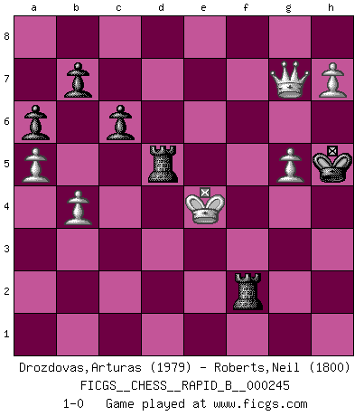 Last move : 1-0 2017 April 25 11:25:28 [Event "FICGS__CHESS__RAPID_B__000245"] [Site "FICGS"] [Date "2016.10.28"] [Round "1"] [White "Drozdovas,Arturas"] [Black "Roberts,Neil"] [Result "1-0"] [WhiteElo "1979"] [BlackElo "1800"] 1.d4 d5 2.c4 c6 3.Nf3 Nf6 4.Nc3 dxc4 5.a4 Bf5 6.e3 e6 7.Bxc4 Bb4 8.O-O O-O 9.Qe2 Nbd7 10.e4 Bg6 11.Bd3 h6 12.Bf4 Re8 13.h3 a6 14.Rac1 Qe7 15.Bb1 Rac8 16.Rfd1 Red8 17.Bh2 Bh7 18.e5 Nd5 19.Bxh7+ Kxh7 20.Bg3 Qf8 21.Bh4 Re8 22.Ne4 Kg8 23.Ne1 f5 24.exf6 N5xf6 25.Nxf6+ Nxf6 26.Rd3 Rcd8 27.Nc2 Bd6 28.Rf3 Rd7 29.Bxf6 gxf6 30.Re1 f5 31.Qc4 Rde7 32.Nb4 h5 33.Nd3 Qf6 34.Ne5 Kh7 35.Rg3 Qh6 36.h4 Qd2 37.Rge3 Bxe5 38.Rxe5 Rd7 39.Rxe6 Qxe1+ 40.Rxe1 Rxe1+ 41.Kh2 R1e7 42.Qc5 Rf7 43.Qe5 Rde7 44.Qg3 Re4 45.Qg5 Rxd4 46.Qxh5+ Kg7 47.f3 R4d7 48.Qg5+ Kh7 49.g3 Rd5 50.h5 Rfd7 51.Qg6+ Kh8 52.b4 Rc7 53.Kh3 Rcd7 54.a5 Rd8 55.g4 fxg4+ 56.fxg4 R8d7 57.g5 Rg7 58.Qh6+ Kg8 59.Kg4 Rd4+ 60.Kf3 Rd5 61.Qe6+ Rf7+ 62.Ke4 Kf8 63.Qc8+ Kg7 64.h6+ Kh7 65.Qe6 Rf2 66.Qe7+ Kg6 67.Qg7+ Kh5 68.h7 1-0 QGD Slav : Dutch variation Kingside Castling by player White (move 8) Kingside Castling by player Black (move 8) Player White won this chess game. Follow this game move after move (download)Before the endgame, the Gods have placed the middle game. (Siegbert Tarrasch) Ich brauche nur einen Blick auf das Schachbrett zu werfen, und weiß schon, was in der Stellung steckt, was geschehen kann und was geschehen wird. Alle übrigen suchen und prüfen, ich aber weiß es! (José Raúl Capablanca) Una partida de Ajedrez se divide en 3 etapas: la primera cuando piensas que tienes la ventaja, la segunda cuando crees que tienes la ventaja y la tercera... ¡cuando te das cuenta que vas a perder!. (Savielly Tartakower) Dieu déplace le joueur, et celui-ci la pièce. Quel Dieu derrière Dieu commence donc la trame ? Arturo Perez-Reverte (prix de littérature policière 1993). The good fighters of old first put themselves beyond the possibility of defeat, and then waited for an opportunity of defeating the enemy. (Sun Tzu)