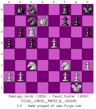 Last move : 1-0 2017 February 18 16:59:50 [Event "FICGS__CHESS__RAPID_B__000245"] [Site "FICGS"] [Date "2016.10.28"] [Round "1"] [White "Domingo,Jordi"] [Black "Faust,Dieter"] [Result "1-0"] [WhiteElo "1826"] [BlackElo "1834"] 1.e4 e5 2.Nf3 Nc6 3.Bc4 Bc5 4.c3 d6 5.d4 exd4 6.cxd4 Bb6 7.Bb5 Bd7 8.Nc3 Nf6 9.O-O O-O 10.h3 Ne7 11.Bd3 h6 12.Be3 c5 13.dxc5 Bxc5 14.e5 Ne8 15.Bxc5 dxc5 16.Qc2 Qc7 17.Rfd1 Bc6 18.Bh7+ Kh8 19.Be4 Rc8 20.Rd2 Rd8 21.Rad1 Rxd2 22.Rxd2 b6 23.Qd3 Bxe4 24.Qxe4 Qc8 25.Qg4 Nc7 26.Qa4 a5 27.Rd6 Qb8 28.Qd7 Nc8 29.Rc6 1-0 Giuoco Piano : LaBourdonnais variation Kingside Castling by player White (move 9) Kingside Castling by player Black (move 9) Player White won this chess game. Follow this game move after move (download)A big shock; the best chess player in history has passed away. (Lajos Portisch, about Bobby Fischer's death) Karpov ist ein Museumsstück. (Garry Kasparov) Cada Peón es potencialmente una Reina. (James Mason) La tactique, c'est ce que vous faites quand il y a quelque chose à faire; la stratégie, c'est ce que vous faites quand il n'y a rien à faire. (Savielli Tartacower) You cannot beat a roulette table unless you steal money from it. (Albert Einstein)