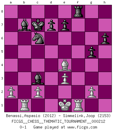 Last move : 0-1 2016 November 2 6:4:42 [Event "FICGS__CHESS__THEMATIC_TOURNAMENT__000212"] [Site "FICGS"] [Date "2016.10.30"] [Round "1"] [White "Benassi,Aspasio"] [Black "Simmelink,Joop"] [Result "0-1"] [WhiteElo "2012"] [BlackElo "2153"] 1.d4 Nf6 2.Bg5 c5 3.e3 Qb6 4.Nc3 Qxb2 5.Nge2 cxd4 6.Rb1 Qa3 7.Nb5 Qa5+ 8.Qd2 Qxd2+ 9.Kxd2 Ne4+ 10.Ke1 Nxg5 11.Nc7+ Kd8 12.Nxa8 dxe3 13.fxe3 b6 14.Nc3 g6 15.h4 Ne6 16.Be2 Nc5 17.Bf3 Nc6 18.h5 Bg7 19.Ne4 Nxe4 20.Bxe4 Bb7 21.hxg6 fxg6 22.Nxb6 axb6 23.Rxb6 Kc7 24.Rb1 h6 25.Kf2 Rf8+ 26.Ke1 g5 27.Rf1 Bc3+ 0-1 Trompowsky attack (Ruth, Opovcensky Opening) Player Black won this chess game. Follow this game move after move (download)Who is your opponent tonight, tonight I am playing against the Black pieces. (Akiba Rubinstein) Jeder weiß, dass Gasprom Putins persönliches Machtinstrument ist. Die Firma wird vom Kreml aus geleitet und wird schon deshalb nie transparent sein. (Garry Kasparov) Un jugador que trata de regresar una movida en el Ajedrez es un futuro carterista. (Richard Fenton) On croit qu'il y a plus de mauvais joueurs que de bons joueurs, c'est faux : Il y a autant de joueurs qui gagnent que de joueurs qui perdent. (Philippe Geluck) The right perception of any matter and a misunderstanding of the same matter do not wholly exclude each other. (Kafka's the trial)