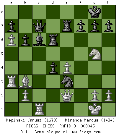 Last move : 0-1 2007 June 16 13:52:29 [Event "FICGS__CHESS__RAPID_B__000045"] [Site "FICGS"] [Date "2007.03.29"] [Round "1"] [White "Kepinski,Janusz"] [Black "Miranda,Marcus"] [Result "0-1"] [WhiteElo "1673"] [BlackElo "1434"] 1.c3 Nf6 2.Nf3 c5 3.e3 e6 4.Be2 d5 5.d4 Be7 6.O-O O-O 7.Nbd2 Nc6 8.a4 Qc7 9.Re1 e5 10.dxe5 Nxe5 11.Nxe5 Qxe5 12.Nf3 Qf5 13.Bd3 Ne4 14.Qe2 Qg6 15.Ne5 Qe6 16.f4 Bf6 17.Nf3 Rd8 18.Nd2 Bd7 19.Rf1 Bc6 20.Nf3 Re8 21.a5 Rad8 22.a6 b6 23.f5 Qd7 24.Ra3 d4 25.cxd4 cxd4 26.Rd1 Nd6 27.Bc2 Nxf5 28.e4 Qc7 29.Re1 Be7 30.Bg5 Bxg5 31.Nxg5 Ne3 32.Bb3 Re7 33.Rc1 Rd6 0-1 This chess game has been lost on time (started : 2007.03.29 21:26:19) Saragossa Opening Kingside Castling by player White (move 6) Kingside Castling by player Black (move 6) Player Black won this chess game. Follow this game move after move (download)Suddenly it was obvious to me in my analysis I had missed what Fischer had found with the greatest of ease at the board. (Mikhail Botvinnik) Ein Isolani verdüstert die Stimmung auf dem ganzen Schachbrett. (Savielly Grigorievitsch Tartakower) No hay un Gran Maestro de Ajedrez que sea normal; solo se diferencían ellos por la magnitud de su locura. (Viktor Korchnoi) Tout change constamment, y compris dans le monde des Echecs. (Botvinnik) The right perception of any matter and a misunderstanding of the same matter do not wholly exclude each other. (Kafka's the trial)