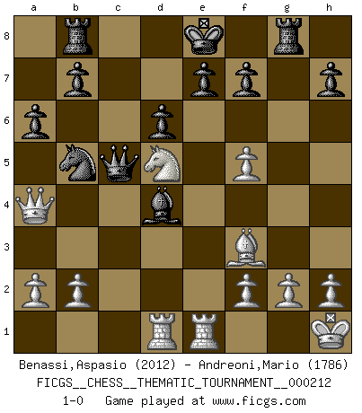 Last move : 1-0 2017 January 26 19:42:35 [Event "FICGS__CHESS__THEMATIC_TOURNAMENT__000212"] [Site "FICGS"] [Date "2016.10.30"] [Round "1"] [White "Benassi,Aspasio"] [Black "Andreoni,Mario"] [Result "1-0"] [WhiteElo "2012"] [BlackElo "1786"] 1.d4 Nf6 2.Bg5 c5 3.Bxf6 gxf6 4.dxc5 Na6 5.Nc3 Nxc5 6.e4 Qa5 7.Qd4 Bg7 8.Nge2 Ne6 9.Qd5 Qb6 10.Qb3 Qc6 11.Rd1 d6 12.Nd5 a6 13.Ng3 Bd7 14.Be2 Nc7 15.Nb6 Be6 16.c4 Rb8 17.O-O Rg8 18.Nf5 Qc5 19.Nd4 Qa5 20.Kh1 f5 21.Nxf5 Bxf5 22.exf5 Qc5 23.Bf3 Qa5 24.Rfe1 Bd4 25.c5 Qxc5 26.Qa4+ Nb5 27.Nd5 1-0 Trompowsky attack (Ruth, Opovcensky Opening) Kingside Castling by player White (move 17) Player White won this chess game. Follow this game move after move (download)One bad move nullifies forty good ones. (Horowitz) Nicht daß Diemer aus Opportunismus Mitglied der NSDAP geworden wäre. Er war ein Fanatiker, in allem, was er tat. (Hans Ree) Los Peones son nacidos libres, y aún así, se encuentran por doquier encadenados. (Rick Kennedy) La tactique, c'est ce que vous faites quand il y a quelque chose à faire; la stratégie, c'est ce que vous faites quand il n'y a rien à faire. (Savielli Tartacower) Shallow men believe in luck. Strong men belive in cause and effect. (Ralph Waldo Emerson)