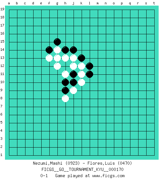 Last move : 0-1 2016 December 18 8:53:19 [Event "FICGS__GO__TOURNAMENT_KYU__000170"] [Site "FICGS"] [Date "2016.10.31"] [Round "1"] [Black "Nezumi,Mashi"] [White "Flores,Luis"] [Result "0-1"] [Rating 1 "0923"] [Rating 2 "0470"] 1.k13 j12 2.j11 k12 3.h12 j13 4.l12 k11 5.j14 h11 6.j10 h13 7.g13 g12 8.h14 g14 9.g15 f13 10.f14 g13 11.l11 k10 12.h10 j9 13.h9 h8 0-1 This go game has been lost on time (started : 2016.10.31 20:31:21) Here are the names of the openings (joseki) played in the four corners : Corner d16 : j12 j11 This joseki is unknown. A weak or weird move has probably been played in this corner. Corner d4 : j9 h9 This joseki is unknown. A weak or weird move has probably been played in this corner. Player White won this Go (weiqi, baduk) game. Follow this game move after move (download)Corner, side, centre. (Anonymous) A good book on your shelf is a friend that turns its back on you and remains a friend. (Author unknown)