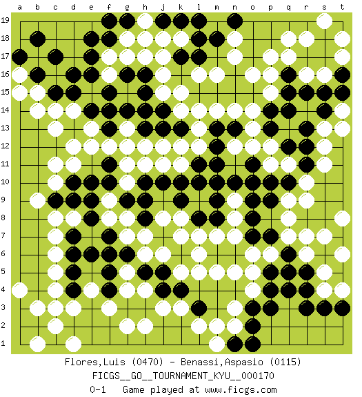 Last move : 0-1 2017 February 18 19:3:31 [Event "FICGS__GO__TOURNAMENT_KYU__000170"] [Site "FICGS"] [Date "2016.10.31"] [Round "1"] [Black "Flores,Luis"] [White "Benassi,Aspasio"] [Result "0-1"] [Rating 1 "0470"] [Rating 2 "0115"] 1.q4 c3 2.d4 r16 3.d16 f17 4.e17 f16 5.e16 r6 6.q6 q7 7.r5 p6 8.q5 r7 9.p7 o6 10.o7 n7 11.o8 n8 12.o9 n9 13.o10 r10 14.n6 n5 15.m6 o4 16.p5 o5 17.p4 m5 18.l6 l5 19.k6 k5 20.n10 l9 21.m10 j6 22.j7 k7 23.j5 h6 24.m9 m7 25.o3 n3 26.o2 q13 27.p3 c4 28.d5 c5 29.d6 d8 30.l8 l7 31.m8 c11 32.l10 c6 33.e6 g4 34.h5 g5 35.j4 n2 36.n1 m1 37.o1 m2 38.s6 s7 39.t7 s5 40.t5 s4 41.s3 t6 42.r4 t8 43.r3 p17 44.f18 g18 45.e18 h17 46.f15 l16 47.m15 m16 48.n16 n17 49.o15 c14 50.c15 d14 51.e14 e13 52.f13 e12 53.d15 f8 54.f7 g8 55.g6 h7 56.h8 g7 57.f6 j3 58.k4 k3 59.g3 f3 60.k9 j11 61.j10 h11 62.h10 g10 63.g9 f9 64.h9 j8 65.k10 k11 66.l11 l12 67.m12 k12 68.j13 l14 69.k13 l13 70.m13 m14 71.l15 k15 72.n15 n14 73.n13 o14 74.p14 p15 75.d13 c13 76.g16 g17 77.h16 j16 78.h15 j18 79.t3 t4 80.s17 s16 81.r17 q18 82.q16 q17 83.q15 o16 84.q14 o13 85.p13 o12 86.q12 r18 87.s18 s19 88.t19 t18 89.r13 p11 90.p10 q11 91.q10 q9 92.p9 r9 93.r11 s11 94.r12 s12 95.o11 p12 96.r15 s13 97.s14 t14 98.t15 t13 99.s15 t17 100.t16 d12 101.g14 n12 102.m11 g12 103.h13 g2 104.f10 g11 105.f11 f12 106.e10 b15 107.b16 b14 108.c17 g13 109.f14 l6 110.g19 h19 111.f19 j15 112.j14 k8 113.k17 j17 114.l19 p16 115.m18 k18 116.l17 a16 117.a17 a15 118.b18 k14 119.k19 h12 120.h14 j12 121.l18 c7 122.d7 c8 123.d10 c10 124.e8 d3 125.h3 h2 126.l3 l2 127.e9 q8 128.j19 h18 129.n19 n18 130.c9 b9 131.d9 d11 132.f5 e4 133.f4 h4 134.b2 b3 135.a3 a4 136.a2 c2 137.c1 d1 138.a1 b1 139.pass pass 0-1 Here are the names of the openings (joseki) played in the four corners : Corner d4 : c3 d4 San-San (Sam-Sam, San-San) 3-3 Point. The San-San (3-3) point, emphasizing territory at the expense of influence. Kata-tsuki (shoulder hit). The shoulder-hit is the traditional answer to the 3-3. The direction of White 3 depends on the positions on the side. Crawling once may be the premise for a follow-up move of sliding with a knight's move in the opposite direction. If White plays 3 at 3-4 (to the right), the follow-on knight's move is then played at the top (e.g. 3-4, 4-5, 5-2). White's knight's move reduces territory potential on the side it is played. Corner d16 : d16 f17 Hoshi (Hwajeom, Seongjeom, Xingwei`) 4-4 Point. The star or hoshi (4-4) point, emphasizing influence at the potential expense of territory. Ikken Kakari (Hankan Keolch'im, Yi Gua`jiao~, 1-Space Low Approach). White 2 is the standard approach move to the 4-4. Corner q4 : q4 r6 Hoshi (Hwajeom, Seongjeom, Xingwei`) 4-4 Point. The star or hoshi (4-4) point, emphasizing influence at the potential expense of territory. Ikken Kakari (Hankan Keolch'im, Yi Gua`jiao~, 1-Space Low Approach). White 2 is the standard approach move to the 4-4. Player White won this Go (weiqi, baduk) game. Follow this game move after move (download)The possibility or impossibility of an event results logically from the rules. (Pierre Audouard) To be champion requires more than simply being a strong player; one has to be a strong human being as well. (Anatoly Karpov)
