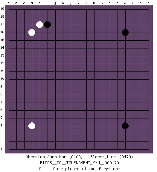 Last move : 0-1 2016 December 4 7:28:59 [Event "FICGS__GO__TOURNAMENT_KYU__000170"] [Site "FICGS"] [Date "2016.10.31"] [Round "1"] [Black "Abrantes,Jonathan"] [White "Flores,Luis"] [Result "0-1"] [Rating 1 "0100"] [Rating 2 "0470"] 1.q16 d4 2.q4 d16 3.f17 e17 0-1 This go game has been lost on time (started : 2016.10.31 20:31:21) Here are the names of the openings (joseki) played in the four corners : Corner d16 : d16 f17 Hoshi (Hwajeom, Seongjeom, Xingwei`) 4-4 Point. The star or hoshi (4-4) point, emphasizing influence at the potential expense of territory. Ikken Kakari (Hankan Keolch'im, Yi Gua`jiao~, 1-Space Low Approach). Black 2 is the standard approach move to the 4-4. Corner d4 : d4 0-1 Hoshi (Hwajeom, Seongjeom, Xingwei`) 4-4 Point. The star or hoshi (4-4) point, emphasizing influence at the potential expense of territory. Player White won this Go (weiqi, baduk) game. Follow this game move after move (download)... {it is} something unearthly... if there are sentient beings on other planets, then they play go. (Emanuel Lasker, chess world champion) It is a good thing for an uneducated man to read books of quotations. (Winston Churchill)