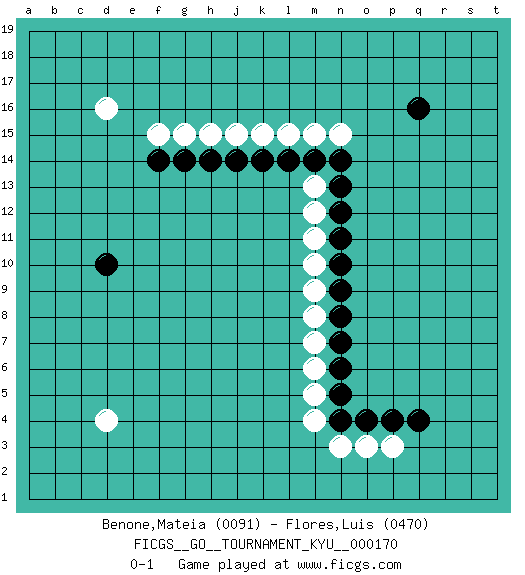 Last move : 0-1 2017 February 18 22:41:27 [Event "FICGS__GO__TOURNAMENT_KYU__000170"] [Site "FICGS"] [Date "2016.10.31"] [Round "1"] [Black "Benone,Mateia"] [White "Flores,Luis"] [Result "0-1"] [Rating 1 "0091"] [Rating 2 "0470"] 1.q16 d16 2.d10 d4 3.q4 p3 4.p4 o3 5.o4 n3 6.n4 m4 7.n5 m5 8.n6 m6 9.n7 m7 10.n8 m8 11.n9 m9 12.n10 m10 13.n11 m11 14.n12 m12 15.n13 m13 16.n14 n15 17.m14 m15 18.l14 l15 19.k14 k15 20.j14 j15 21.h14 h15 22.g14 g15 23.f14 f15 0-1 Here are the names of the openings (joseki) played in the four corners : Corner q4 : q4 p3 Hoshi (Hwajeom, Seongjeom, Xingwei`) 4-4 Point. The star or hoshi (4-4) point, emphasizing influence at the potential expense of territory. Corner d16 : d16 j14 Hoshi (Hwajeom, Seongjeom, Xingwei`) 4-4 Point. The star or hoshi (4-4) point, emphasizing influence at the potential expense of territory. Corner d4 : d4 0-1 Hoshi (Hwajeom, Seongjeom, Xingwei`) 4-4 Point. The star or hoshi (4-4) point, emphasizing influence at the potential expense of territory. Player White won this Go (weiqi, baduk) game. Follow this game move after move (download)Josekis are not fixed, definitive things. They indicate the moments when everything can change. (Pierre Audouard) In God we trust, all others we virus scan. (Anonymous)