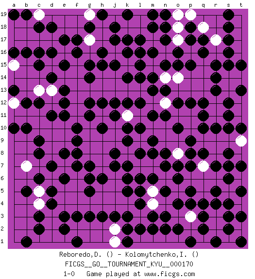 Last move : 1-0 2017 October 13 11:6:58 [Event "FICGS__GO__TOURNAMENT_KYU__000170"] [Site "FICGS"] [Date "2016.10.31"] [Round "1"] [Black "Reboredo,Daniel"] [White "Kolomytchenko,Igor"] [Result "1-0"] 1.d4 e4 2.q16 e5 3.d16 d15 4.q4 q5 5.p5 p6 6.e15 e16 7.r5 q6 8.p4 o5 9.o6 n6 10.o7 o8 11.n7 m7 12.n8 n9 13.m8 l9 14.p8 o9 15.m9 m10 16.l8 k8 17.l10 k11 18.k9 j9 19.k7 j6 20.d14 c13 21.c15 f15 22.m11 h10 23.f16 g16 24.f17 f13 25.g15 f14 26.e3 c5 27.d5 d6 28.e6 e7 29.c6 b7 30.d7 d8 31.e8 e9 32.f8 g8 33.f9 g9 34.c8 d9 35.f7 f6 36.g6 f5 37.h16 g17 38.g18 h17 39.j17 h18 40.j18 j19 41.g5 h5 42.f10 f11 43.g11 h11 44.o4 n4 45.n3 m4 46.e11 f12 47.n5 m5 48.m6 l7 49.l6 l5 50.k5 k4 51.m3 l3 52.l4 m4 53.l5 m5 54.k3 j4 55.j3 h4 56.h3 g4 57.g7 h7 58.g3 f4 59.h6 j5 60.j7 h8 61.j8 h9 62.k6 j2 63.l2 l1 64.k1 m1 65.m2 n1 66.n2 o1 67.o2 r6 68.r4 q7 69.p9 q9 70.o10 n10 71.n11 n12 72.n13 n14 73.m13 l13 74.o12 m12 75.l12 k13 76.k12 j13 77.j12 h13 78.h12 g13 79.g12 n12 80.n15 o14 81.o15 p14 82.p15 q15 83.r15 q14 84.r14 q13 85.r13 p13 86.p12 o13 87.m14 m15 88.l15 k15 89.m16 m17 90.l17 l18 91.m18 k18 92.k17 k16 93.n17 o17 94.f3 d3 95.h19 g19 96.k19 l19 97.m19 g10 98.j11 j10 99.k10 h11 100.h10 e10 101.c9 d10 102.d11 c10 103.b10 c11 104.c12 b11 105.b12 a11 106.a10 a12 107.a13 a12 108.b5 c4 109.c3 d2 110.c2 c1 111.e2 d1 112.b1 e1 113.f1 j1 114.k2 s5 115.q8 r8 116.q10 r9 117.r10 s9 118.s10 t9 119.t10 t11 120.s11 t12 121.s12 r12 122.q12 r11 123.q11 s13 124.j15 j16 125.k14 j14 126.l16 n16 127.o16 o14 128.e13 d13 129.e12 e14 130.e17 d17 131.g14 h14 132.h15 k15 133.k16 g17 134.d18 c17 135.c18 b18 136.c16 b17 137.b16 a17 138.a16 a15 139.l14 n14 140.s4 t4 141.s3 r3 142.p1 s2 143.q3 r2 144.t3 t5 145.p7 o8 146.s6 t6 147.t7 t8 148.s7 t6 149.t5 t2 150.q2 q1 151.r1 s1 152.t1 s1 153.s2 p3 154.r7 q7 155.s8 t9 156.t13 s14 157.s15 t14 158.t15 t16 159.s16 t17 160.s17 t18 161.s18 t19 162.b19 a18 163.a19 c19 164.p17 o18 165.p18 q18 166.s19 p19 167.q17 r17 168.n18 o19 169.n19 1-0 This go game has been lost on time (started : 2016.10.31 20:31:21) Here are the names of the openings (joseki) played in the four corners : Corner d4 : d4 e4 Hoshi (Hwajeom, Seongjeom, Xingwei`) 4-4 Point. The star or hoshi (4-4) point, emphasizing influence at the potential expense of territory. Corner d16 : d16 d15 Hoshi (Hwajeom, Seongjeom, Xingwei`) 4-4 Point. The star or hoshi (4-4) point, emphasizing influence at the potential expense of territory. Corner q4 : q4 q5 Hoshi (Hwajeom, Seongjeom, Xingwei`) 4-4 Point. The star or hoshi (4-4) point, emphasizing influence at the potential expense of territory. Player Black won this Go (weiqi, baduk) game. Follow this game move after move (download)The nature of a game comes from what is played, but it's the sensitivity to the possible and the impossible that gives it value. (Pierre Audouard) Rules and bones are meant to be broken. (Anonymous)