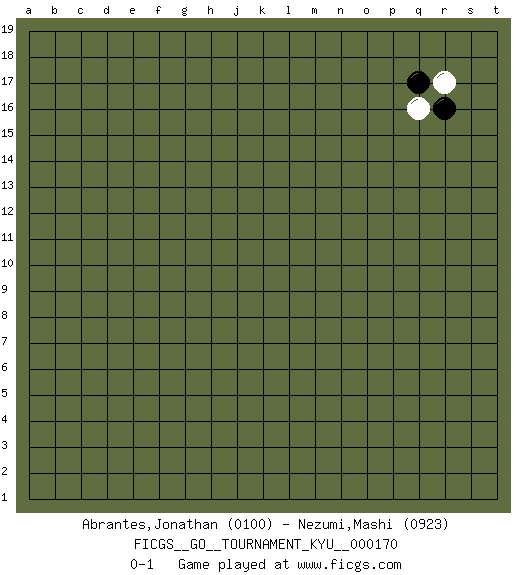 Last move : 0-1 2016 December 12 20:19:29 [Event "FICGS__GO__TOURNAMENT_KYU__000170"] [Site "FICGS"] [Date "2016.10.31"] [Round "1"] [Black "Abrantes,Jonathan"] [White "Nezumi,Mashi"] [Result "0-1"] [Rating 1 "0100"] [Rating 2 "0923"] 1.r16 q16 2.q17 r17 0-1 This go game has been lost on time (started : 2016.10.31 20:31:21) Here are the names of the openings (joseki) played in the four corners : Corner q16 : r16 q16 Komoku (Somok, Xiao~mu`) 3-4 Point. The komoku (3-4) point is the traditional corner enclosure move.. Player White won this Go (weiqi, baduk) game. Follow this game move after move (download)There is no territory in the centre. (Anonymous) Always two there are. No more no less. A master, and an apprentice. (Master Yoda in Star Wars ep.1)