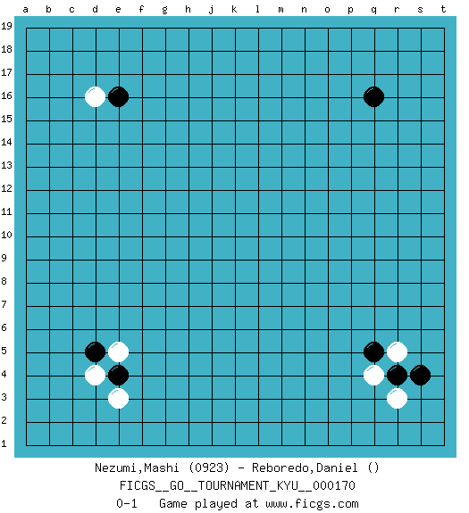 Last move : 0-1 2016 December 16 20:52:55 [Event "FICGS__GO__TOURNAMENT_KYU__000170"] [Site "FICGS"] [Date "2016.10.31"] [Round "1"] [Black "Nezumi,Mashi"] [White "Reboredo,Daniel"] [Result "0-1"] [Rating 1 "0923"] 1.q16 d4 2.e4 d16 3.e16 q4 4.q5 e5 5.d5 r5 6.r4 r3 7.s4 e3 0-1 This go game has been lost on time (started : 2016.10.31 20:31:21) Here are the names of the openings (joseki) played in the four corners : Corner d4 : d4 e4 Hoshi (Hwajeom, Seongjeom, Xingwei`) 4-4 Point. The star or hoshi (4-4) point, emphasizing influence at the potential expense of territory. Corner d16 : d16 e16 Hoshi (Hwajeom, Seongjeom, Xingwei`) 4-4 Point. The star or hoshi (4-4) point, emphasizing influence at the potential expense of territory. Corner q4 : q4 q5 Hoshi (Hwajeom, Seongjeom, Xingwei`) 4-4 Point. The star or hoshi (4-4) point, emphasizing influence at the potential expense of territory. Player White won this Go (weiqi, baduk) game. Follow this game move after move (download)Don't make compact groups of stones. (Anonymous) Kids, you tried your best and you failed miserably. The lesson is, never try. (Simpsons)