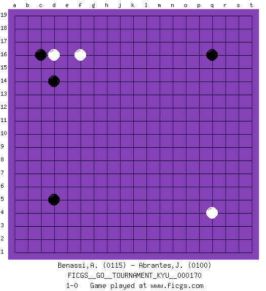 Last move : 1-0 2016 December 5 7:40:34 [Event "FICGS__GO__TOURNAMENT_KYU__000170 "] [Site "FICGS"] [Date "2016.10.31"] [Round "1"] [Black "Benassi,Aspasio "] [White "Abrantes,Jonathan "] [Result "1-0"] [Rating 1 "0115"] [Rating 2 "0100"] 1.q16 q4 2.d5 d16 3.d14 f16 4.c16 1-0 This go game has been lost on time (started : 2016.10.31 20:31:21) Here are the names of the openings (joseki) played in the four corners : Corner d16 : d16 d14Hoshi (Hwajeom, Seongjeom, Xingwei`) 4-4 Point. The star or hoshi (4-4) point, emphasizing influence at the potential expense of territory.Ikken Takagakari (Hankan Nop'dakeolch'im, Yi Gaojia, 1-Space High Approach). White typically responds at 6-4 or 3-10. White 4-10 is played when White finds play on the right side advantageous. White 4-8 or 3-8 may be played when White has support at top. Corner d4 : d5 1-0Takamoku (Gomok, Gaomu`) 5-4 Point. The takamoku (high) point (5-4). With its emphasis on influence, the 5-4 point complements the 4-4 (hoshi) point in creating an influence-oriented fuseki. Player Black won this Go (weiqi, baduk) game.Follow this game move after move (download ) Take the cutting stone on the second line. (Anonymous) I live to kill Traxler counterattack. (Ilmars Cirulis)