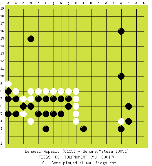 Last move : 1-0 2017 February 18 22:40:45 [Event "FICGS__GO__TOURNAMENT_KYU__000170"] [Site "FICGS"] [Date "2016.10.31"] [Round "1"] [Black "Benassi,Aspasio"] [White "Benone,Mateia"] [Result "1-0"] [Rating 1 "0115"] [Rating 2 "0091"] 1.q16 q4 2.d15 d4 3.d6 d7 4.e7 d8 5.c6 e8 6.f7 f8 7.g7 g8 8.f3 h8 9.h7 j8 10.j7 k8 11.l3 e6 12.e5 f6 13.f5 g6 14.h5 h6 15.j6 k7 16.q10 k6 17.g5 k5 18.r6 c7 19.q3 b6 20.b5 c5 21.b7 a6 22.a5 k4 23.r4 b8 24.a8 a9 25.a7 1-0 Here are the names of the openings (joseki) played in the four corners : Corner d4 : d4 d6 Hoshi (Hwajeom, Seongjeom, Xingwei`) 4-4 Point. The star or hoshi (4-4) point, emphasizing influence at the potential expense of territory. Ikken Takagakari (Hankan Nop'dakeolch'im, Yi Gaojia, 1-Space High Approach). White typically responds at 6-4 or 3-10. White 4-10 is played when White finds play on the right side advantageous. White 4-8 or 3-8 may be played when White has support at top. Corner q4 : q4 l3 Hoshi (Hwajeom, Seongjeom, Xingwei`) 4-4 Point. The star or hoshi (4-4) point, emphasizing influence at the potential expense of territory. Player Black won this Go (weiqi, baduk) game. Follow this game move after move (download)While the Baroque rules of chess could only have been created by humans, the rules of go are so elegant, organic, and rigorously logical that if intelligent life forms exist elsewhere in the universe, they almost certainly play go. (Edward Lasker, international chess master) A good teacher is like a candle - it consumes itself to light the way for others. (Author unknown)