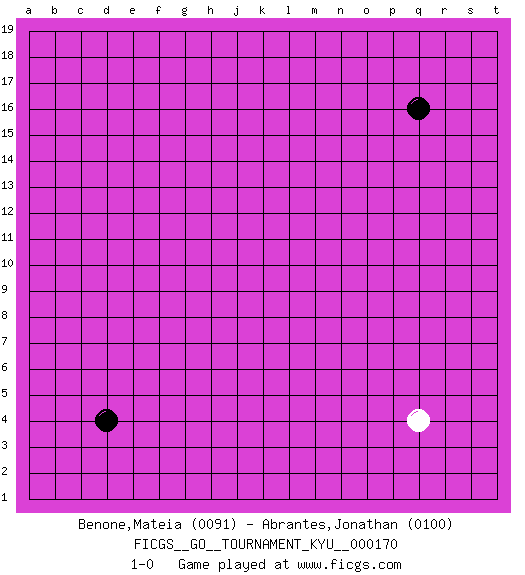 Last move : 1-0 2016 December 16 20:52:55 [Event "FICGS__GO__TOURNAMENT_KYU__000170"] [Site "FICGS"] [Date "2016.10.31"] [Round "1"] [Black "Benone,Mateia"] [White "Abrantes,Jonathan"] [Result "1-0"] [Rating 1 "0091"] [Rating 2 "0100"] 1.d4 q4 2.q16 1-0 This go game has been lost on time (started : 2016.10.31 20:31:21) Here are the names of the openings (joseki) played in the four corners : Player Black won this Go (weiqi, baduk) game. Follow this game move after move (download)Go is not a blocking game, it's a game of action. (Pierre Audouard) Good decisions come from experience, and experience comes from bad decisions. (Anonymous)