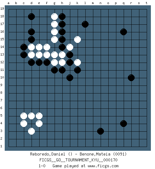 Last move : 1-0 2017 February 20 16:3:21 [Event "FICGS__GO__TOURNAMENT_KYU__000170"] [Site "FICGS"] [Date "2016.10.31"] [Round "1"] [Black "Reboredo,Daniel"] [White "Benone,Mateia"] [Result "1-0"] [Rating 2 "0091"] 1.d4 e4 2.q16 e5 3.q4 d5 4.d16 c5 5.r10 c4 6.l17 d3 7.c13 d13 8.d12 e13 9.c14 d14 10.d15 e14 11.e12 f13 12.f12 f14 13.n3 g12 14.g11 h12 15.h11 j11 16.j12 k12 17.j13 g13 18.k11 h13 19.j10 j14 20.h16 k15 21.h14 g15 22.h15 g16 23.h17 g17 24.h18 g18 25.d18 1-0 This go game has been lost on time (started : 2016.10.31 20:31:21) Here are the names of the openings (joseki) played in the four corners : Corner d4 : d4 e4 Hoshi (Hwajeom, Seongjeom, Xingwei`) 4-4 Point. The star or hoshi (4-4) point, emphasizing influence at the potential expense of territory. Player Black won this Go (weiqi, baduk) game. Follow this game move after move (download)If your stone is capped, play the knight's move. (Anonymous) Once you start thinking you have nothing left to learn, you have everything to learn. (Steve Badget)