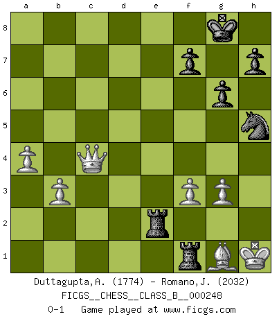Last move : 0-1 2017 July 28 17:4:13 [Event "FICGS__CHESS__CLASS_B__000248"] [Site "FICGS"] [Date "2016.11.01"] [Round "1"] [White "Duttagupta,Aniruddha"] [Black "Romano,Jacopo"] [Result "0-1"] [WhiteElo "1774"] [BlackElo "2032"] 1.e4 c5 2.Nf3 d6 3.Bb5+ Bd7 4.Bxd7+ Qxd7 5.c4 Nc6 6.d4 cxd4 7.Nxd4 g6 8.Nc3 Bg7 9.Be3 Nf6 10.f3 O-O 11.O-O a6 12.a4 e6 13.Rc1 Rfc8 14.b3 Qe7 15.Qd2 d5 16.exd5 exd5 17.cxd5 Nb4 18.Bf4 Nh5 19.d6 Qf6 20.d7 Rd8 21.Be3 Rxd7 22.Ne4 Qe7 23.Kh1 Nf6 24.Nc5 Rd5 25.Bg1 Rxc5 26.Qxb4 Rxc1 27.Qxe7 Rxf1 28.Qxb7 Re8 29.Qxa6 R8e1 30.Ne2 Nh5 31.Qc4 Be5 32.g3 Bxg3 33.hxg3 Rxe2 0-1 Sicilian : Canal-Sokolsky attack, Sokolsky variation Kingside Castling by player Black (move 10) Kingside Castling by player White (move 11) Player Black won this chess game. Follow this game move after move (download)When you play Bobby, it is not a question if you win or lose. It is a question if you survive. (Boris Spassky) Es gibt zwei Arten von Opfern: Korrekte und meine. (Mikhail Nekhemyevich Tal) Todos los jugadores de Ajedrez deberían tener un pasatiempo. (Savielly Tartakower) Il n'y a plus de joueurs du niveau de Jacob Murray dont la seule quête est le beau jeu, le plaisir de voir les pièces construire quelque chose. Sur 10 idées à la minute, 9 seront sans intérêt, la dernière s'avèrera géniale. (Christian Bauer) I'll be back. (Arnold Schwarzenegger)
