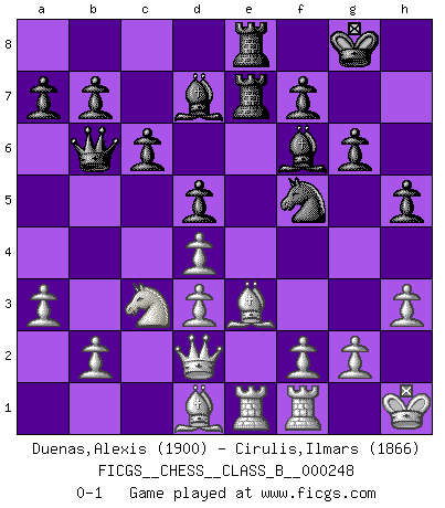 Last move : 0-1 2016 November 1 20:44:3 [Event "FICGS__CHESS__CLASS_B__000248"] [Site "FICGS"] [Date "2016.11.01"] [Round "1"] [White "Duenas,Alexis"] [Black "Cirulis,Ilmars"] [Result "0-1"] [WhiteElo "1900"] [BlackElo "1866"] 1.d4 e6 2.c4 d5 3.cxd5 exd5 4.Nc3 Be7 5.Qc2 Nc6 6.Nf3 Nb4 7.Qb1 g6 8.Ne5 Nf6 9.a3 Bf5 10.Nd3 Nxd3+ 11.exd3 c6 12.Be2 O-O 13.O-O Ne8 14.Be3 Ng7 15.Qc2 Bd7 16.Rae1 Nf5 17.Bd1 Bf6 18.Ne2 Re8 19.Qd2 Qb6 20.h3 Re7 21.Kh1 Rae8 22.Nc3 h5 0-1 Queen's pawn Kingside Castling by player Black (move 12) Kingside Castling by player White (move 13) Player Black won this chess game. Follow this game move after move (download)War is the child of passion, passion is the child of narcissism and narcissism is the child. (...) Another game ? (Thibault de Vassal) Die Elozahlen sind sehr schlecht für das Schach. Jetzt ist Schach eine Sportindustrie, die darauf zielt Elopunkte zu machen. (Miguel Najdorf) Bendita sea la memoria de aquel que dio al mundo este juego inmortal. (A. G. Gardiner) Les échecs sont utiles à l'exercice de la faculté de penser et à celle de l'imagination. Car nous devons posséder une méthode élaborée pour atteindre des buts partout où nous devons conduire notre raison. (Leibnitz) There is a very easy way to return from a casino with a small fortune : go there with a large one. (Jack Yelton)