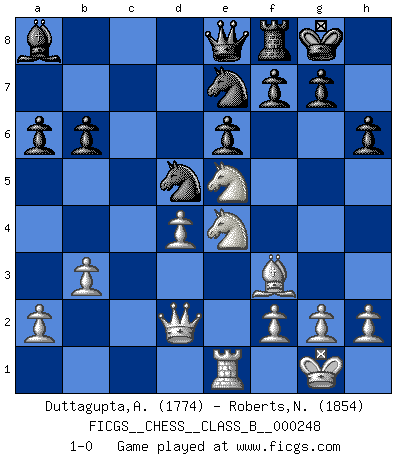 Last move : 1-0 2017 June 25 10:16:22 [Event "FICGS__CHESS__CLASS_B__000248"] [Site "FICGS"] [Date "2016.11.01"] [Round "1"] [White "Duttagupta,Aniruddha"] [Black "Roberts,Neil"] [Result "1-0"] [WhiteElo "1774"] [BlackElo "1854"] 1.c4 c6 2.e4 d5 3.exd5 cxd5 4.cxd5 Nf6 5.Nc3 Nxd5 6.Nf3 Nc6 7.Bb5 e6 8.O-O Bd6 9.d4 O-O 10.Re1 Nce7 11.Ne4 Bb4 12.Bd2 Bxd2 13.Qxd2 b6 14.Ne5 Bb7 15.Rac1 Rc8 16.Rxc8 Bxc8 17.Rc1 a6 18.Be2 Bb7 19.Bf3 h6 20.b3 Ba8 21.Rd1 Qe8 22.Re1 1-0 This chess game has been lost on time (started : 2016.11.01 15:19:42) English : Caro-Kann defensive system Kingside Castling by player White (move 8) Kingside Castling by player Black (move 9) Player White won this chess game. Follow this game move after move (download)Not all artists are Chess players, but all Chess players are artists. (Marcel Duchamp) Am wohlsten fühle ich mich, wenn ich sehe, wie sich mein Gegner im Todeskampf windet. (Robert James Fischer) Las leyes del Ajedrez no permiten una libre elección: tienes que mover quieras o no. (Emanuel Lasker) On est toujours la mazette de quelqu'un d'autre. (Anonyme) Patience, use the Force, think ! (Obi-Wan Kenobi in Star Wars ep.2)