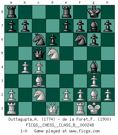 Last move : 1-0 2017 March 12 11:8:20 [Event "FICGS__CHESS__CLASS_B__000248"] [Site "FICGS"] [Date "2016.11.01"] [Round "1"] [White "Duttagupta,Aniruddha"] [Black "de la Foret,Fred"] [Result "1-0"] [WhiteElo "1774"] [BlackElo "1900"] 1.c4 Nf6 2.g3 d6 3.Bg2 c5 4.Nf3 g6 5.Nc3 Nc6 6.d4 cxd4 7.Nxd4 Bd7 8.b3 Bg7 9.Bb2 O-O 10.O-O Re8 11.Nc2 Qa5 12.Nd5 Bg4 13.Bc3 Qc5 14.b4 1-0 English, 1...Nf6 (Anglo-Indian defense) Kingside Castling by player Black (move 9) Kingside Castling by player White (move 10) Player White won this chess game. Follow this game move after move (download)The tactician knows what to do when there is something to do; whereas the strategian knows what to do when there is nothing to do. (Gerald Abrahams) Wie gewinnt Tal? Er entwickelt alle seine Figuren in die Brettmitte und opfert sie dann irgendwo. (Robert James Fischer) Ayuda a tus piezas para que ellas te puedan ayudar. (Paul Morphy) Ne tendez aucun piège pour le plaisir ! Ne jouez rien dans l'espoir que l'adversaire réagisse de façon stupide ! Prenez toujours pour acquis que l'adversaire va trouver le meilleur coup ! Ne jouez jamais de coup dans l'espoir que l'adversaire ne voie pas la menace ! Chacun de vos coups doit améliorer la position d'une façon ou d'une autre. There are three kinds of lies: lies, damned lies and statistics. (Mark Twain)