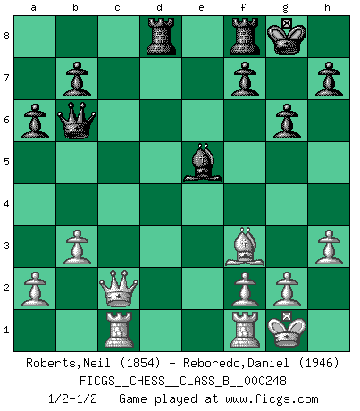 Last move : 1/2-1/2 2017 March 3 1:43:20 [Event "FICGS__CHESS__CLASS_B__000248"] [Site "FICGS"] [Date "2016.11.01"] [Round "1"] [White "Roberts,Neil"] [Black "Reboredo,Daniel"] [Result "1/2-1/2"] [WhiteElo "1854"] [BlackElo "1946"] 1.d4 d5 2.Bf4 Nf6 3.e3 c5 4.Nf3 Nc6 5.c3 Qb6 6.b3 Bg4 7.h3 Bxf3 8.Qxf3 g6 9.Bd3 Bg7 10.O-O O-O 11.Nd2 Rad8 12.Rac1 a6 13.Qd1 Nd7 14.Nf3 e5 15.dxe5 Ndxe5 16.Be2 d4 17.exd4 cxd4 18.cxd4 Nxf3+ 19.Bxf3 Bxd4 20.Qc2 Ne5 21.Bxe5 Bxe5 1/2-1/2 Queen's pawn, Mason variation Kingside Castling by player White (move 10) Kingside Castling by player Black (move 10) This chess game ended in a draw. Follow this game move after move (download)In a gambit you give up a Pawn for the sake of getting a lost game. (Samuel Standige Boden) Sehr viele beherrschen heutzutage das große Einmalseins des Schachspiels und kennen sogar dessen Logarithmentafeln auswendig - deshalb sollte man hin und wieder zu beweisen trachten, dass zwei mal zwei auch fünf sein kann. (Mikhail Nekhemyevich Tal) Ser exitoso en el Ajedrez te permite descubrir tu propia personalidad. Eso es lo que deseo para los niños de mi clase. (Saudin Robovic) Le temps de noter son nom sur la feuille de partie, j'étais déjà en zeitnot ! D'un modeste amateur apparié lors de la première ronde d'un open contre le grand-maître Azmaïparashvili. Computers have lots of memory but no imagination. (Anonymous)