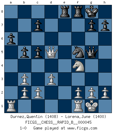 Last move : 1-0 2007 May 31 11:43:12 [Event "FICGS__CHESS__RAPID_B__000045"] [Site "FICGS"] [Date "2007.03.29"] [Round "1"] [White "Durnez,Quentin"] [Black "Lorena,June"] [Result "1-0"] [WhiteElo "1408"] [BlackElo "1400"] 1.e4 Nc6 2.Nf3 e5 3.Bb5 a6 4.Ba4 b5 5.Bb3 Nd4 6.Nxe5 Qg5 7.Ng4 Bc5 8.d3 Qg6 9.O-O Nxb3 10.axb3 Ne7 11.Qf3 d6 12.Be3 O-O 13.Bxc5 dxc5 14.Ne3 f5 15.Nc3 fxe4 16.Qxe4 Bf5 17.Nxf5 Nxf5 18.Nd5 Rae8 19.Nf4 Qg5 20.Qd5+ 1-0 This chess game has been lost on time (started : 2007.03.29 21:26:19) KP : Nimzovich defense Kingside Castling by player White (move 9) Kingside Castling by player Black (move 12) Player White won this chess game. Follow this game move after move (download)Bobby Fischer's current state of mind is indeed a tragedy. One of the world's greatest Chess players - the pride and sorrow of American Chess. (Frank Brady) Du musst nicht gut spielen, es reicht, wenn du besser spielst als dein Gegner. (Anonymous) Todos los Maestros de Ajedrez fueron un día unos principiantes. (Chernev) RxDa4 pat (...) There is far too much law for those who can afford it and far too little for those who cannot. (Derek Bok)
