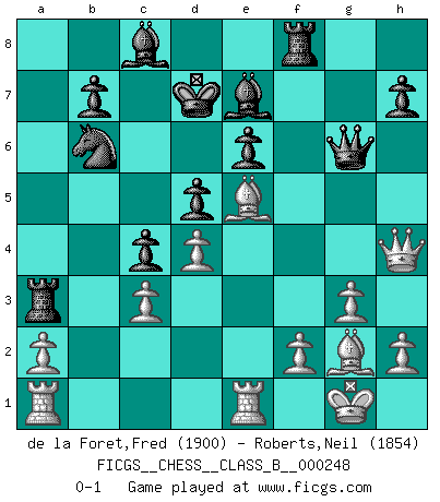 Last move : 0-1 2017 March 12 11:9:36 [Event "FICGS__CHESS__CLASS_B__000248"] [Site "FICGS"] [Date "2016.11.01"] [Round "1"] [White "de la Foret,Fred"] [Black "Roberts,Neil"] [Result "0-1"] [WhiteElo "1900"] [BlackElo "1854"] 1.e4 e6 2.d4 d5 3.Nc3 Nf6 4.e5 Nfd7 5.Nf3 c5 6.Nb5 a6 7.Bg5 f6 8.exf6 gxf6 9.Be3 axb5 10.c3 c4 11.g3 Bd6 12.Bg2 Nc6 13.O-O b4 14.Re1 Nb6 15.Bh6 bxc3 16.bxc3 Kd7 17.Qd2 Ra3 18.Bg7 Rg8 19.Qh6 Qe8 20.Bxf6 Qg6 21.Qh4 Rf8 22.Ne5+ Nxe5 23.Bxe5 Be7 0-1 French : Steinitz variation Kingside Castling by player White (move 13) Player Black won this chess game. Follow this game move after move (download)Every Pawn is a potential Queen. (James Mason) Schon mancher Spieler hat aufgegeben, um zu vermeiden, daß er eine Figur verliert. (Savielly Grigorievitsch Tartakower) Todos los jugadores de Ajedrez deberían tener un pasatiempo. (Savielly Tartakower) Les Echecs sont et restent toujours un combat, un combat intégral comme la boxe, la lutte ou un autre sport, et où il doit y avoir un vainqueur et un vaincu. (Joseph Emil Diemer) A clear conscience is usually the sign of a bad memory. (Unknown)