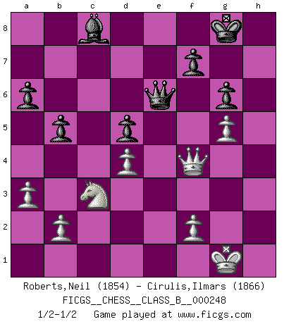 Last move : 1/2-1/2 2017 May 12 15:58:35 [Event "FICGS__CHESS__CLASS_B__000248"] [Site "FICGS"] [Date "2016.11.01"] [Round "1"] [White "Roberts,Neil"] [Black "Cirulis,Ilmars"] [Result "1/2-1/2"] [WhiteElo "1854"] [BlackElo "1866"] 1.d4 e6 2.Nf3 d5 3.Bf4 Be7 4.e3 Nf6 5.c4 O-O 6.Nc3 b6 7.Be2 Bb7 8.cxd5 exd5 9.h3 Re8 10.Ne5 Nbd7 11.Bb5 Qc8 12.Nxd7 Nxd7 13.Rc1 a6 14.Be2 Qd8 15.O-O Nf8 16.Bg4 c6 17.Re1 g6 18.e4 h5 19.Bf3 Rc8 20.Qd3 Ne6 21.Be5 Bf8 22.g3 Ng5 23.exd5 Nxf3+ 24.Qxf3 cxd5 25.Bf6 Rxe1+ 26.Rxe1 Qd7 27.g4 hxg4 28.hxg4 Re8 29.Rxe8 Qxe8 30.g5 b5 31.a3 Qe6 32.Qf4 Bc8 33.Qh4 Bg7 34.Bxg7 Kxg7 35.Qf4 Kg8 36.Kg2 Qh3+ 37.Kg1 Qe6 38.Kg2 Qh3+ 39.Kg1 Qe6 1/2-1/2 Queen's pawn Kingside Castling by player Black (move 5) Kingside Castling by player White (move 15) This chess game ended in a draw. Follow this game move after move (download)A big shock; the best chess player in history has passed away. (Lajos Portisch, about Bobby Fischer's death) In Buenos Aires ist es nicht mein vorrangiges Ziel ein starkes Turnier zu organisieren, sondern ein Turnier für Gentlemen. Ich würde nie Kamsky einladen. Ich mag keine Probleme. (Miguel Najdorf) ¡Examina movidas que hagan daño! Un buen ojo for movidas desvastantes es mucho mas importante que el conocimiento de principios estratégicos. (Purdy) La tactique, c'est ce que vous faites quand il y a quelque chose à faire; la stratégie, c'est ce que vous faites quand il n'y a rien à faire. (Savielli Tartacower) Chess, like love, like music, has the power to make people happy. (Siegbert Tarrasch)