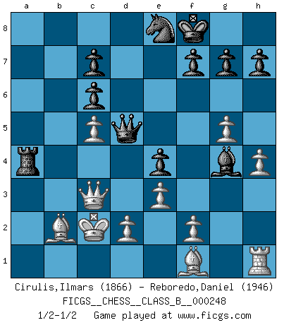 Last move : 1/2-1/2 2016 December 6 1:44:59 [Event "FICGS__CHESS__CLASS_B__000248"] [Site "FICGS"] [Date "2016.11.01"] [Round "1"] [White "Cirulis,Ilmars"] [Black "Reboredo,Daniel"] [Result "1/2-1/2"] [WhiteElo "1866"] [BlackElo "1946"] 1.b4 e5 2.a3 d5 3.Bb2 Bd6 4.Nf3 Qe7 5.c4 dxc4 6.e3 Nf6 7.Bxc4 O-O 8.Nc3 e4 9.Nd4 Nc6 10.Nxc6 bxc6 11.Qc2 Bd7 12.Na4 a5 13.Nc5 axb4 14.axb4 Rxa1+ 15.Bxa1 Ra8 16.Bb2 Bf5 17.Qc3 Ne8 18.Be2 Bxc5 19.bxc5 Qg5 20.g4 Be6 21.h4 Qd5 22.Kd1 Kf8 23.Kc2 Ra4 24.g5 Bg4 25.Bf1 Be6 26.Be2 Bg4 27.Bf1 1/2-1/2 Polish (Sokolsky) opening Kingside Castling by player Black (move 7) This chess game ended in a draw. Follow this game move after move (download)You need not play well - just help your opponent to play badly. (Genrikh Chepukaitis) Ich hatte meine größten Erfolge, als ich 47 Jahre alt war. Kasparow war noch nicht mal 42 und hat das Schach schon im Stich gelassen. (Viktor Kortschnoi) Bobby es la celebridad menos entendida y malinterpretada que camina el la faz de esta tierra. (Yasser Seirawan) Les sacrifices démontrent seulement que quelqu'un a gaffé. (Savielly Tartacover) They say poker is a zero-sum game. It must be, because every time I play my sum ends up zero. (Max Shapiro)