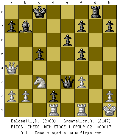 Last move : 0-1 2017 January 17 9:2:20 [Event "FICGS__CHESS__WCH_STAGE_1_GROUP_02__000017"] [Site "FICGS"] [Date "2016.11.02"] [Round "1"] [White "Balosetti,Davide"] [Black "Grammatica,Andrea"] [Result "0-1"] [WhiteElo "2000"] [BlackElo "2147"] 1.e4 c5 2.Nf3 e6 3.d4 cxd4 4.Nxd4 Nc6 5.Nxc6 bxc6 6.c4 Nf6 7.Bd3 d5 8.e5 dxc4 9.exf6 cxd3 10.Qa4 Bb7 11.O-O gxf6 12.Be3 Rg8 13.Nd2 Qd5 14.f3 Bc5 15.Bxc5 Qxc5+ 16.Kh1 O-O-O 17.Rac1 Qe3 18.Ne4 d2 19.Rcd1 f5 20.Nc3 Rxg2 21.Kxg2 Rg8+ 22.Kh1 c5 0-1 Sicilian defense Kingside Castling by player White (move 11) Queenside Castling by player Black (move 16) Player Black won this chess game. Follow this game move after move (download)Fischer sacrificed virtually everything most of us weakies (to use his term) value, respect, and cherish, for the sake of an artful, often beautiful board game, for the ambivalent privilege of being its greatest master. (Paul Kollar) Der Bart als Geschlechtszeichen mitten im Gesicht ist obszön. Daher gefällt er den Weibern. [Zugegeben, kein Schachzitat, aber unglaublich originell] (Arthur Schopenhauer) No es suficiente ser un buen jugador, se debe también de jugar bién. (Siegbert Tarrasch) Le jeu d'échecs fait naître et fortifie en nous plusieurs qualités précieuses dans le cours de l'existence, telles que la prévoyance, la circonspection, la prudence, et la persévérance. (Benjamin Franklin - 1783, la morale des échecs) You have to believe in yourself. (Sun Tzu)