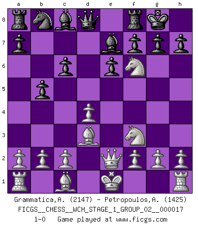 Last move : 1-0 2016 December 16 8:48:59 [Event "FICGS__CHESS__WCH_STAGE_1_GROUP_02__000017"] [Site "FICGS"] [Date "2016.11.02"] [Round "1"] [White "Grammatica,Andrea"] [Black "Petropoulos,Athanasios"] [Result "1-0"] [WhiteElo "2147"] [BlackElo "1425"] 1.e4 c6 2.d4 d5 3.Nd2 dxe4 4.Nxe4 e6 5.Nf3 Be7 6.Bc4 Nf6 7.Qe2 b5 8.Bd3 O-O 9.Nxf6+ 1-0 This chess game has been lost on time (started : 2016.11.02 2:19:24) Caro-Kann : 3.Nd2 Kingside Castling by player Black (move 8) Player White won this chess game. Follow this game move after move (download)Bobby is the finest Chess player this country ever produced. His memory for the moves, his brilliance in dreaming up combinations, and his fierce determination to win are uncanny. (John Collins) Die westlichen Werte sind eine Sprache, welche die Putin-Administration nicht versteht. (Garry Kasparov) Yo jugué Ajedrez con el y a veces le pude haber ganado solo que siempre devuelve su última jugada y juega la partida de manera diferente. (Mark Twain) Mais n'est-ce pas déjà le limiter injurieusement que d'appeler les échecs un jeu? N'est-ce pas aussi une science, un art, ou quelque chose qui, comme le cercueil de Mahomet entre ciel et terre, est suspendu entre l'un et l'autre, et qui réunit un nombre incroyable de contraires ? (Stefan Zweig) Political correctness is subjecting us to gross incompetence. (Johann Piek)