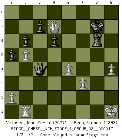 Last move : 1/2-1/2 2017 April 13 12:2:11 [Event "FICGS__CHESS__WCH_STAGE_1_GROUP_02__000017"] [Site "FICGS"] [Date "2016.11.02"] [Round "1"] [White "Velasco,Jose Maria"] [Black "Pech,Stepan"] [Result "1/2-1/2"] [WhiteElo "2027"] [BlackElo "1293"] 1.d4 Nf6 2.c4 g6 3.Nc3 Bg7 4.e4 d6 5.Nf3 O-O 6.Be2 e5 7.O-O Nc6 8.d5 Ne7 9.b4 Nh5 10.Re1 f5 11.Rb1 a5 12.b5 b6 13.Bd3 Bd7 14.Ng5 f4 15.Ne6 Bxe6 16.dxe6 Bf6 17.Be2 Ng7 18.Bg4 h5 19.Bh3 g5 20.f3 Ng6 21.g3 Qe8 22.gxf4 exf4 23.Nd5 Nxe6 24.Kh1 Rd8 25.Nxf6+ Rxf6 26.Bb2 Ne5 27.Rg1 Kh7 28.Bxe6 Qxe6 29.Rxg5 Rg8 30.Rxh5+ Rh6 31.Rxh6+ Kxh6 32.Bxe5 Qxe5 33.Qd5 Rg5 34.Qd2 Qc5 35.h4 Rg6 36.Qxf4+ Kh7 37.Qf7+ Kh6 38.Qe8 Kg7 39.Qe7+ Kh6 40.Qd8 Kh7 41.Qd7+ Kh6 42.Qc8 Kg7 43.Qh3 Qxc4 44.Qd7+ 1/2-1/2 King's Indian : Orthodox, Aronin-Taimanov variation (Yugoslav attack / Mar del Plata variation) Kingside Castling by player Black (move 5) Kingside Castling by player White (move 7) This chess game ended in a draw. Follow this game move after move (download)Modern Chess is too much concerned with things like Pawn structure. Forget it, Checkmate ends the game. (Nigel Short) Ich suche im Schach immer etwas Eigenes. Riskantes Spiel im Stile schachlicher Musketiere ist nicht meine Sache, auch wenn es vielen Freunden scharfer Wendungen gefällt. (Anatoly Karpov) Buenas posiciones no logran ganar juegos, buenas movidas sí. (Gerald Abrahams) Seul un grand joueur sait à quel point il joue faiblement. (Xavier Tartacover) A belief is an idea the mind possesses, an idea that possesses the mind. (Robert Oxden Bolton)